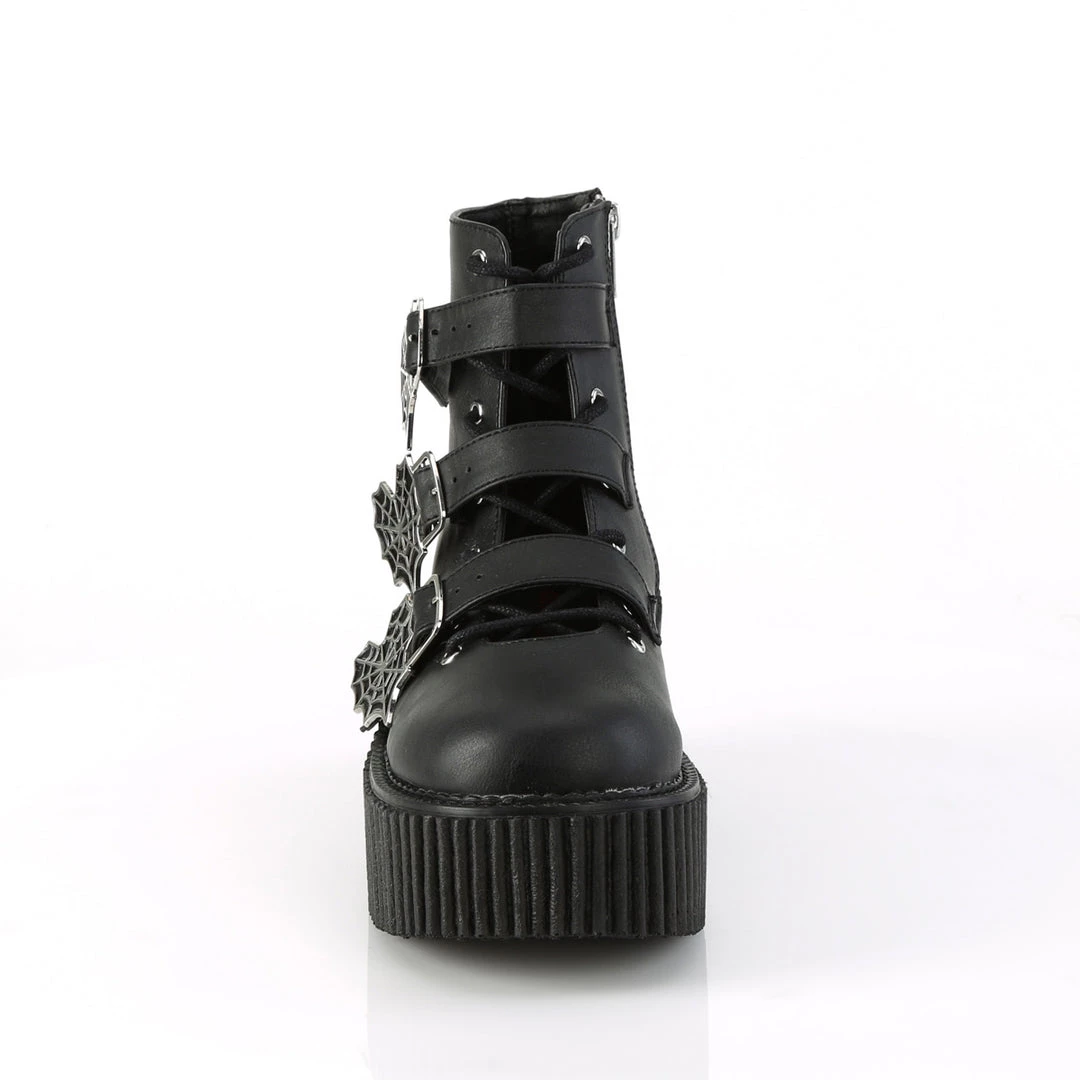 Additional Info: 3″ (7.6cm) Platform Open Front Lacing Ankle High Creeper Boot Featuring 3 Heart Shaped Spider Web Buckle Straps.