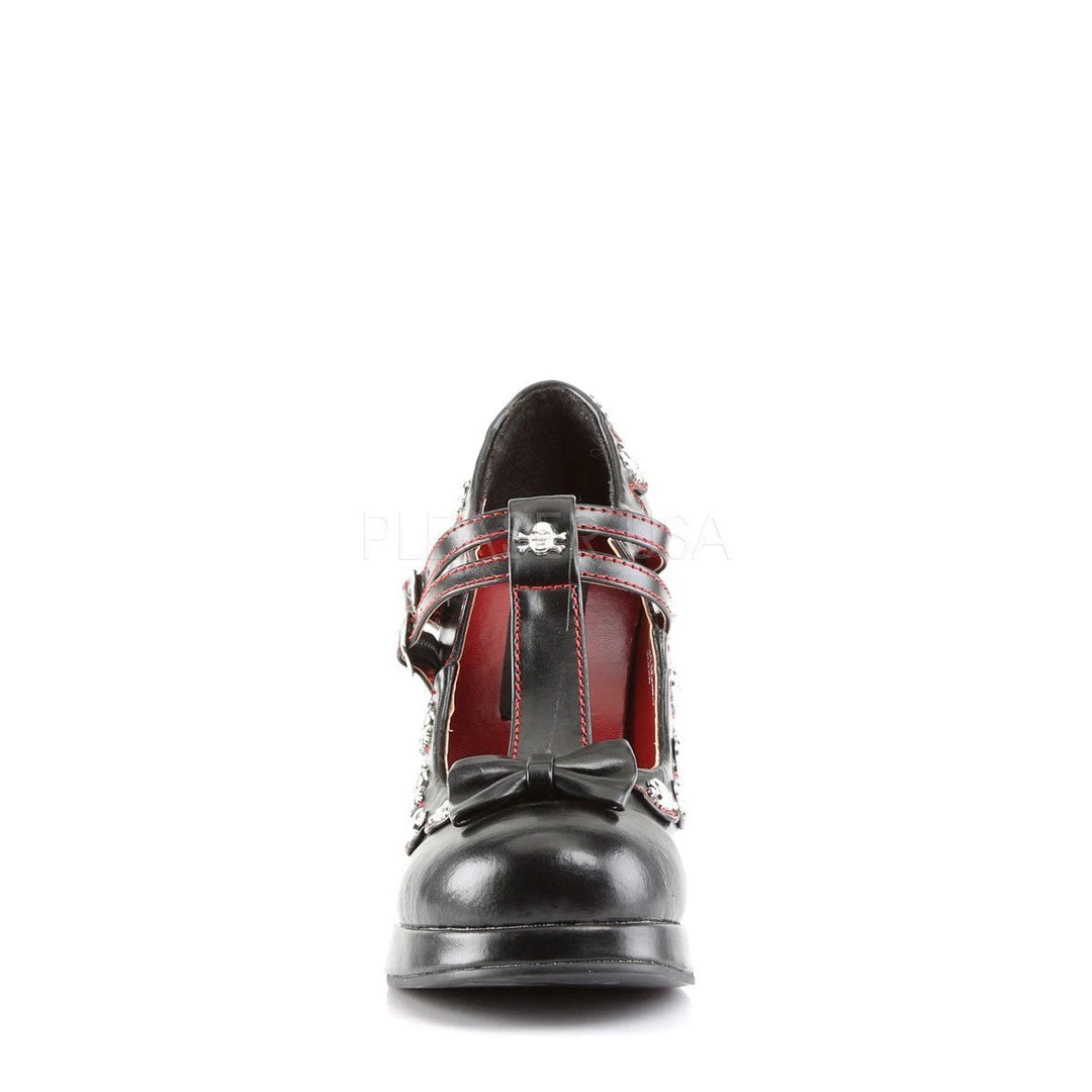 Additional Info: 4″ (10.2cm) Heel, 3/4″ (1.9cm) Platform Goth Punk Lolita T-Strap Mary Jane with Skull Stud and Bow.