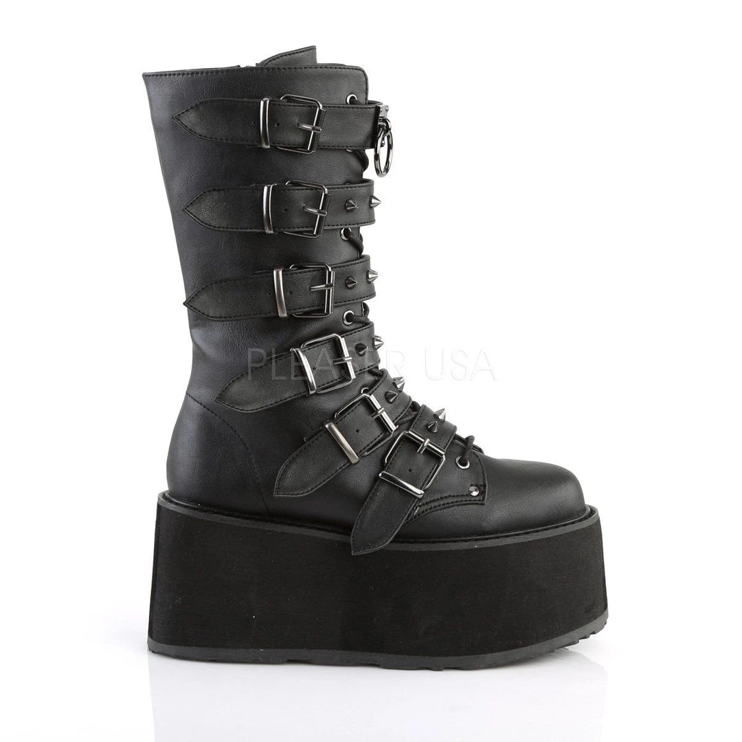 Additional Info: 3 1/2″ (90mm) Platform Lace-Up Front Mid-Calf Boot Featuring 6 Cone-Studded Buckle Straps, Inner Side Metal Zip Closure.
