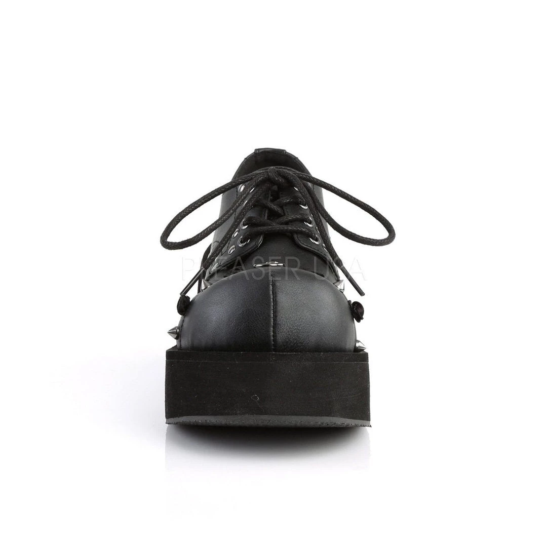 Additional Info: 3 1/4″ (8.3cm) Platform Lace-Up Oxford Shoe Featuring Studs, Cone Spike O-Ring & Mini Satin Roses on Vamp.
