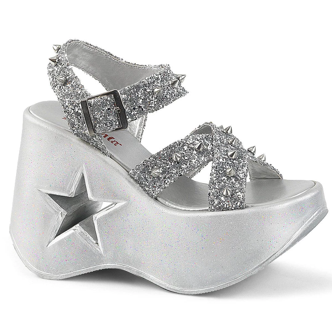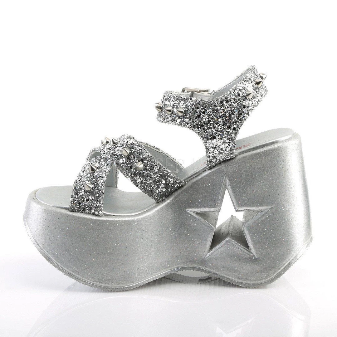 Additional Info: 5″ (12.7cm) Star Cutout Criss Cross Ankle Strap Platform Wedge Sandal with Cone Spike Detail on Straps, Silver Glitter.