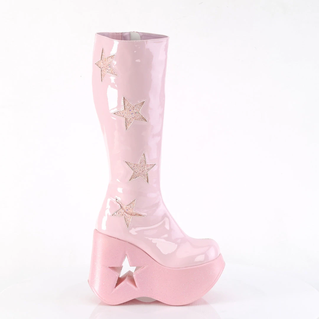 Additional Info: 5″ (127mm) Star Cutout Platform Wedge Knee High Boot Featuring Glitter Star Side Patch Details, Inner Side Metal Zip Closure.