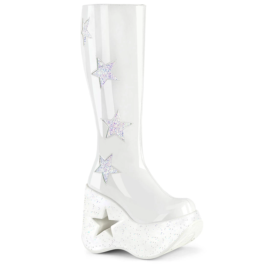 Additional Info: 5″ (127mm) Star Cutout Platform Wedge Knee High Boot Featuring Glitter Star Side Patch Details, Inner Side Metal Zip Closure.
