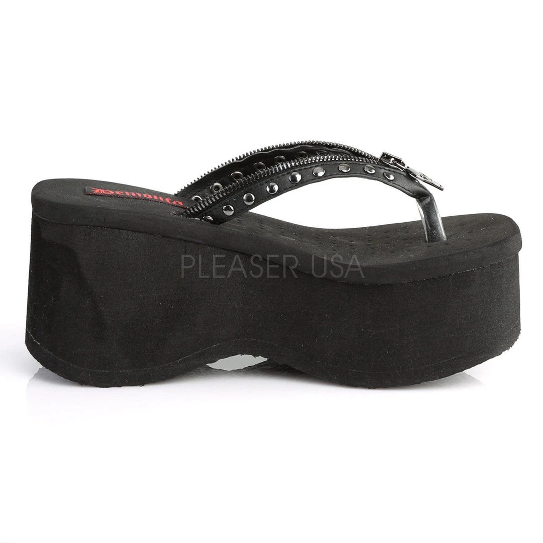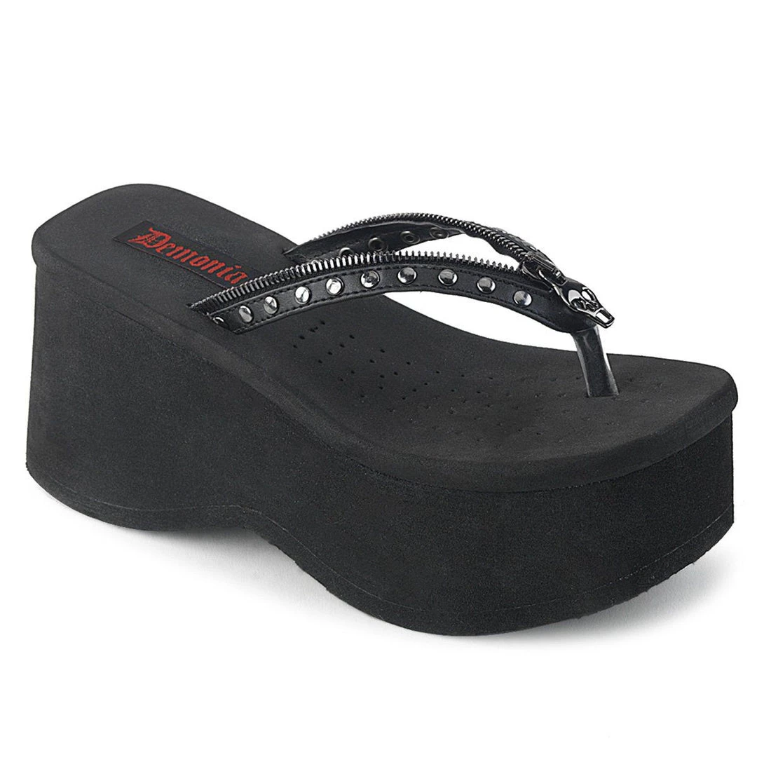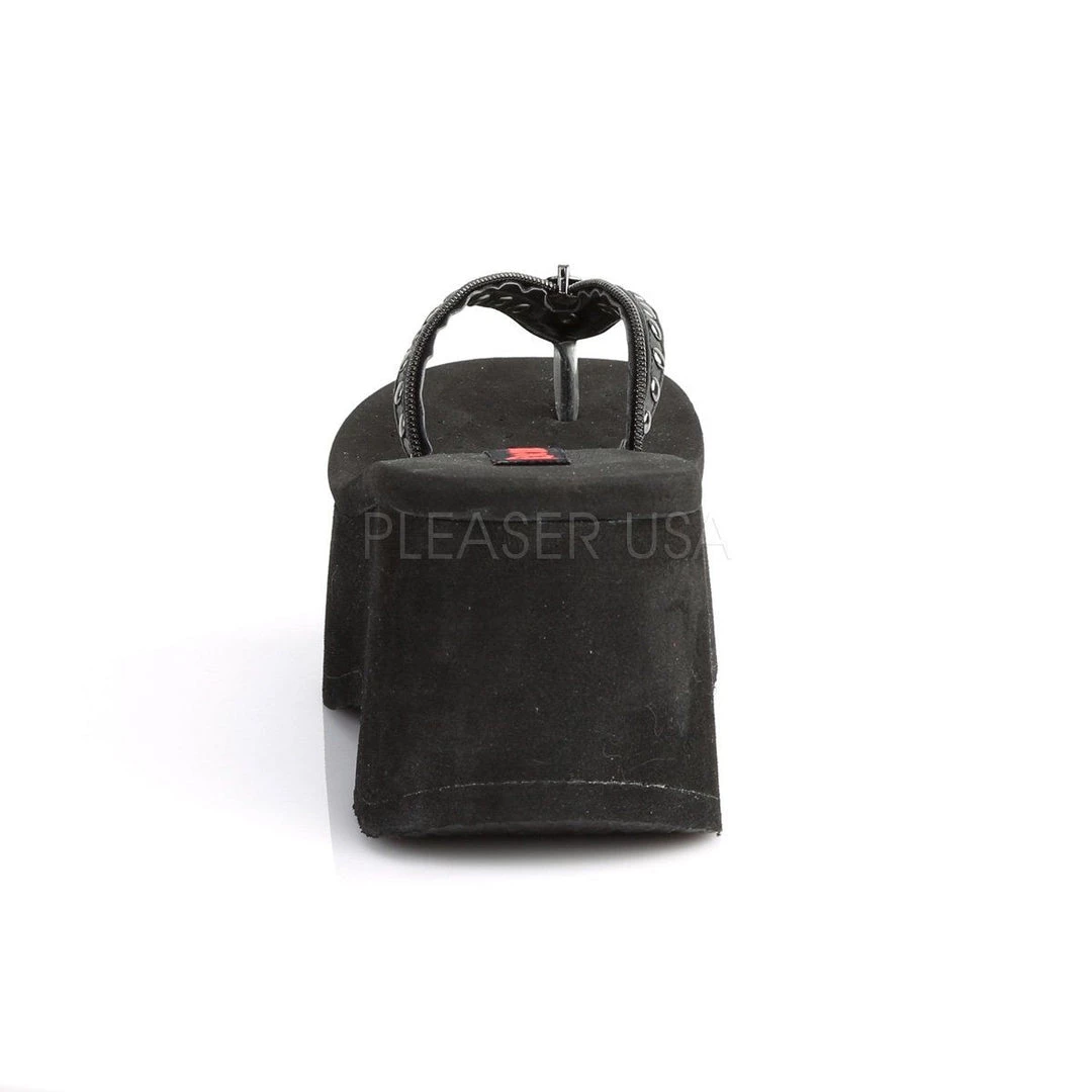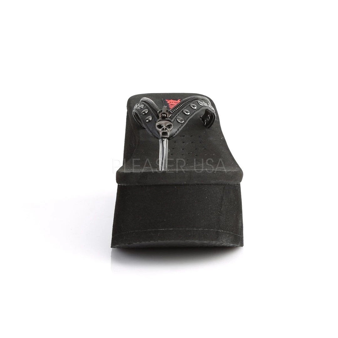 Additional Info: 3 1/2″ (89mm) Platform Studded Thong Sandal Featuring Ornamental Zip Closure Trim w/ Skull Zip Closure Head.