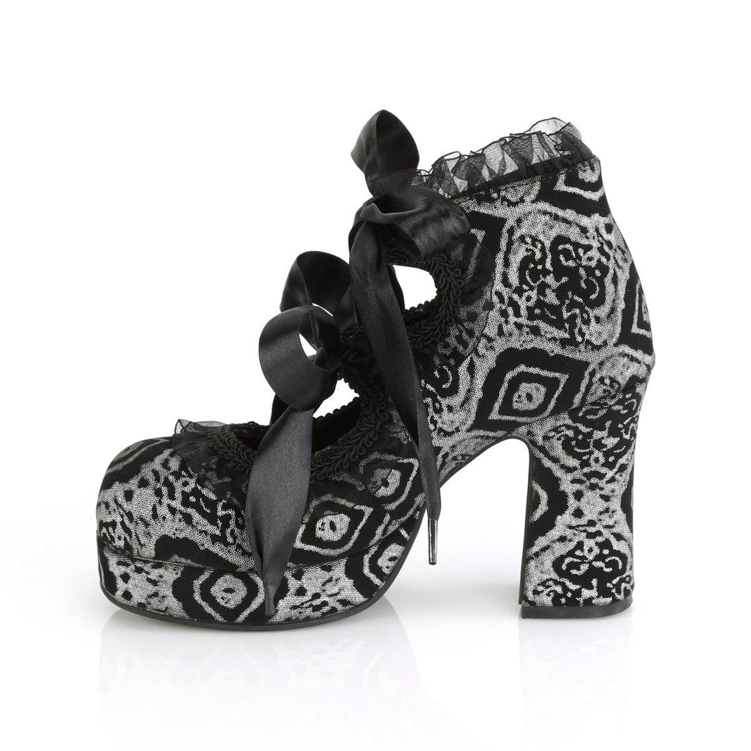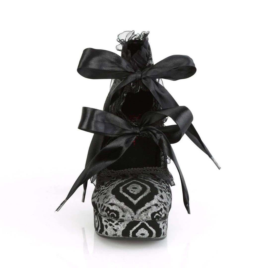 Additional Info: 3 3/4″ (95mm) Heel, 1″ (25mm) Platform Lace-Up Front Shoe Featuring Double Heart Cutout Design and Lace Trim.