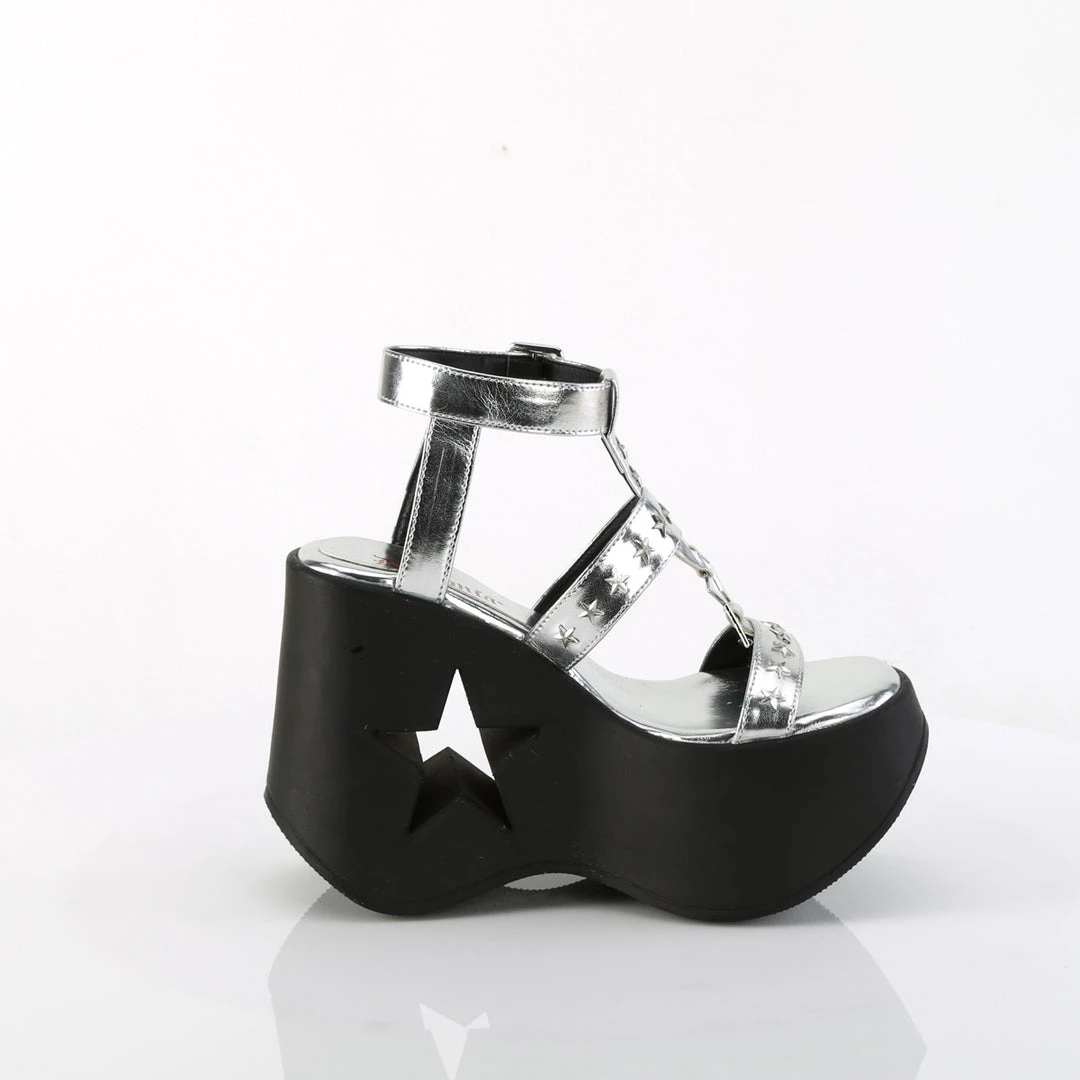 Details: 5 Inch Star Cutout Plaform Wedge Wrap Around Ankle Strap Sandal.