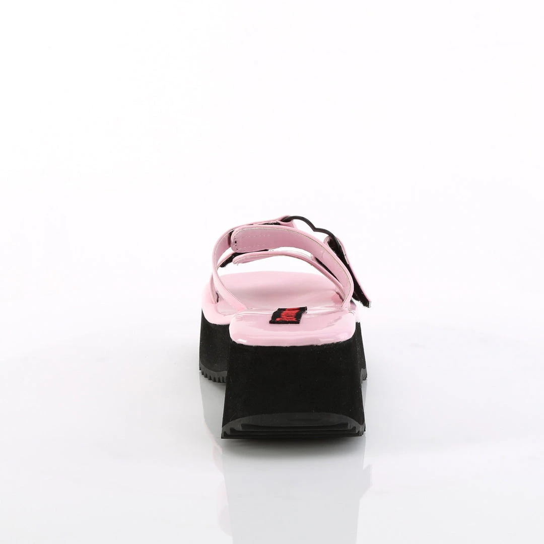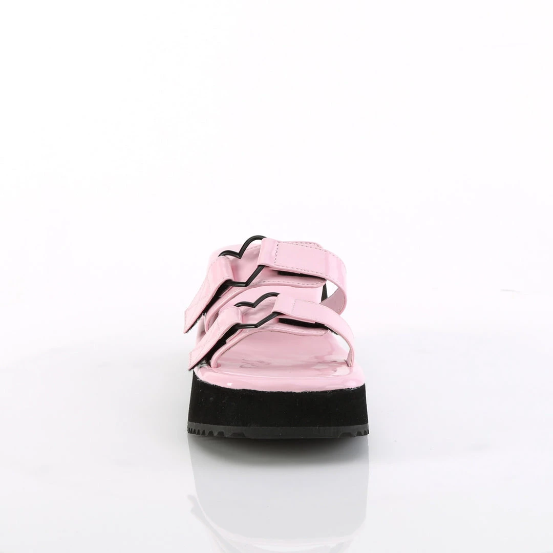 Additional Info: 2 1/2″ (64 mm) Platform Two Band Hook N’ Loop Slide Sandal Featuring Heart Ring Detail.
