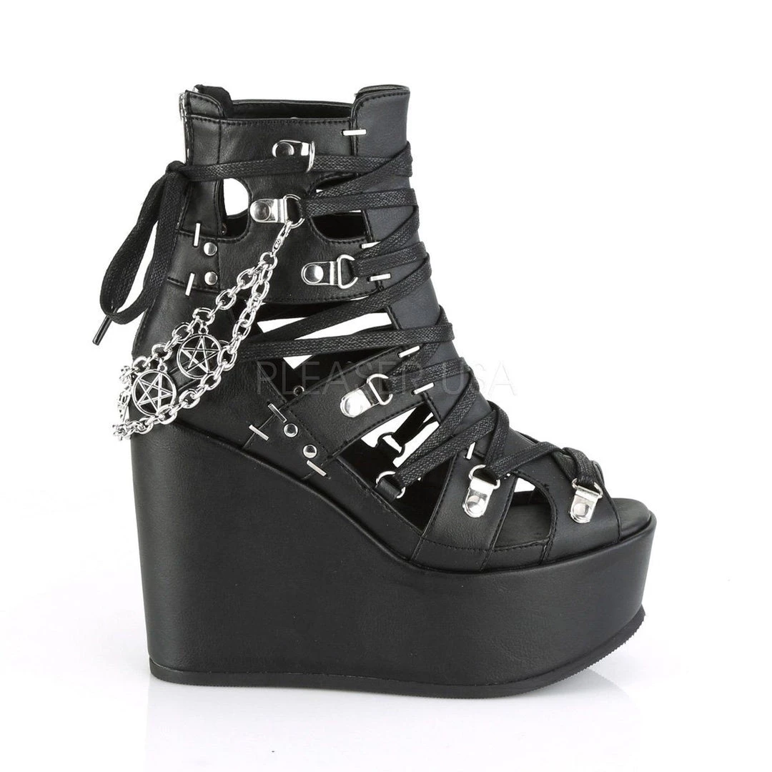 Details: 5 Inch Wedge Plaform Peeptoe Cage Bootie, Back Metal Zip.