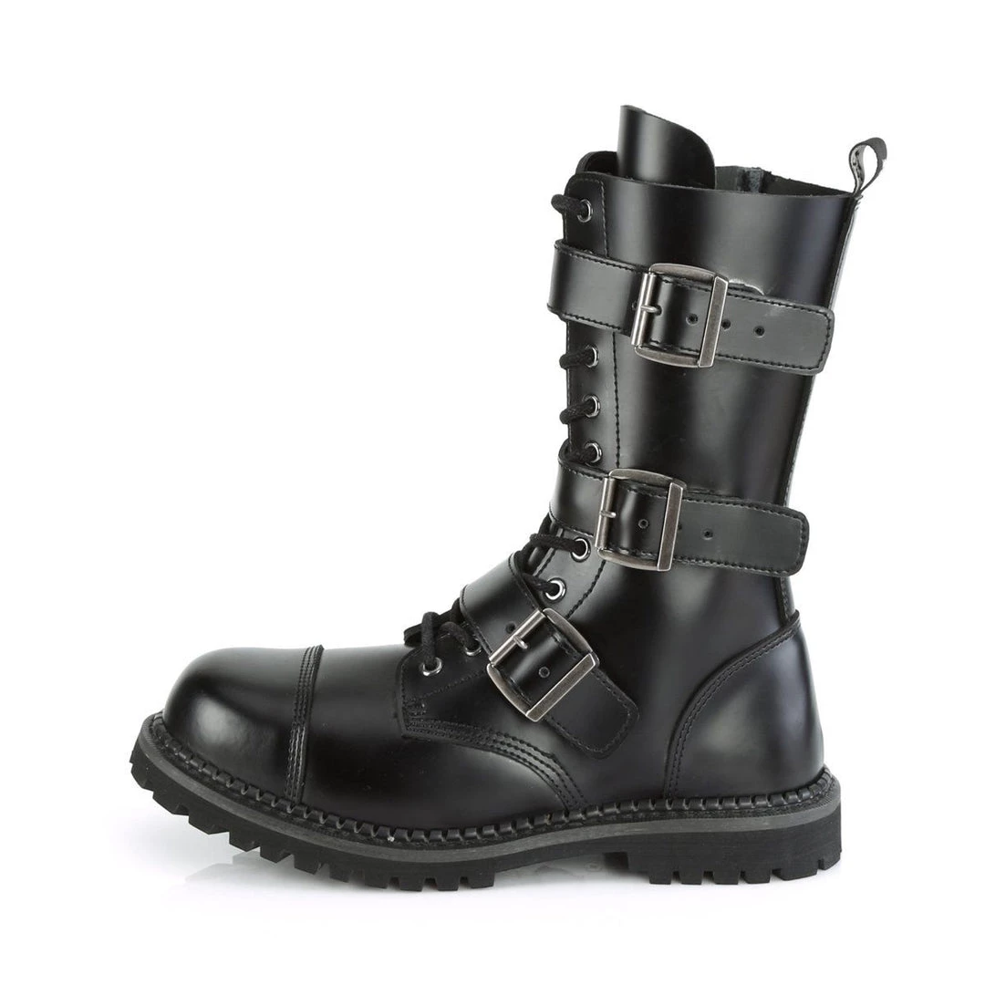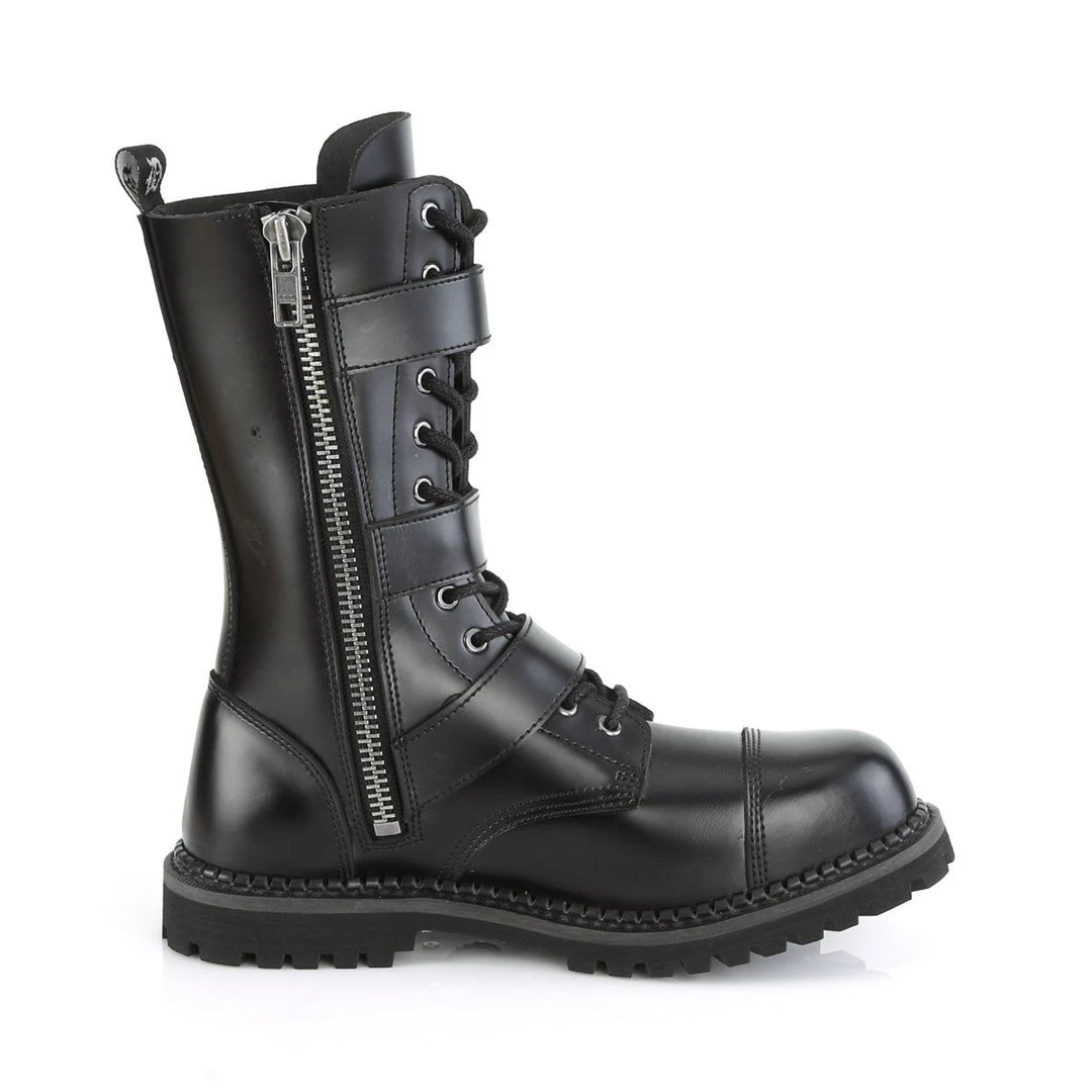 Additional Info: Demonia 12 Eyelet Unisex Leather Steel Toe Lace-Up Triple Buckle Ankle Boot, Rubber Sole, Full Length Inner Side Zip Closure.