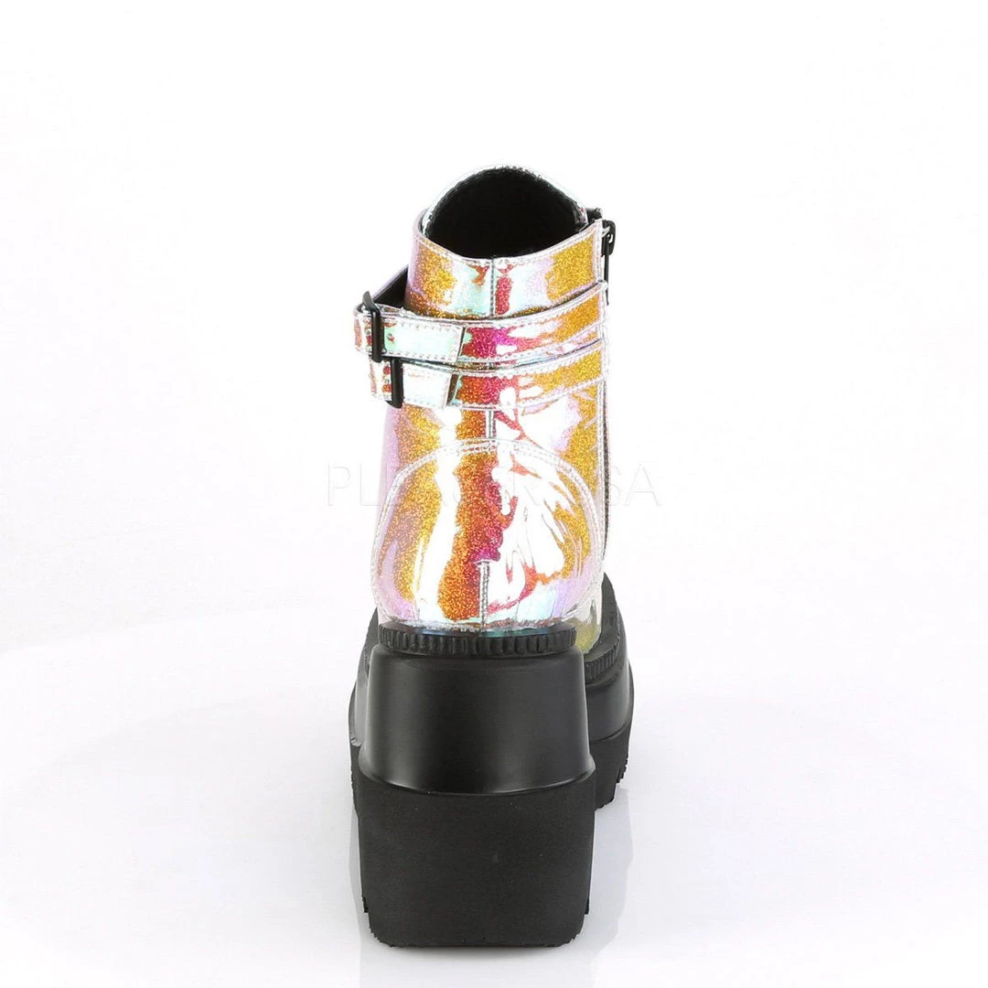Additional Info: 4 1/2″ (114mm) Wedge Platform Lace-Up Front Ankle Boot w/ Double Buckled Ankle Straps, Inner Side Zip Closure.