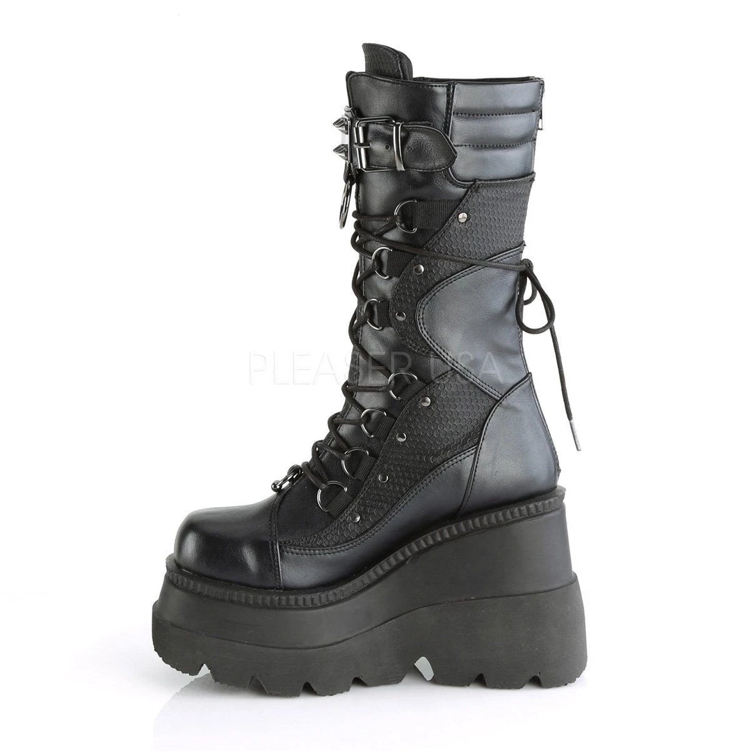 Details: 1/2 Inch Wedge Plaform Lace-Up Mid-Calf Boot, Back Metal Zipper.