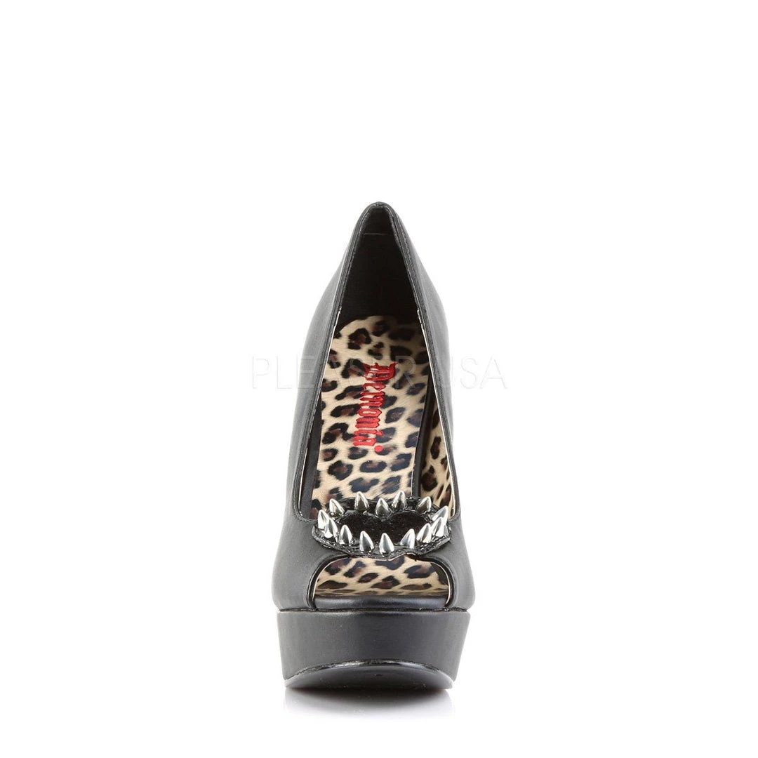 Details: 5 1/4 Inch Heel,1 1/4 Inch Plaform Peep Toe Cutout Pump with Spikes Detail.