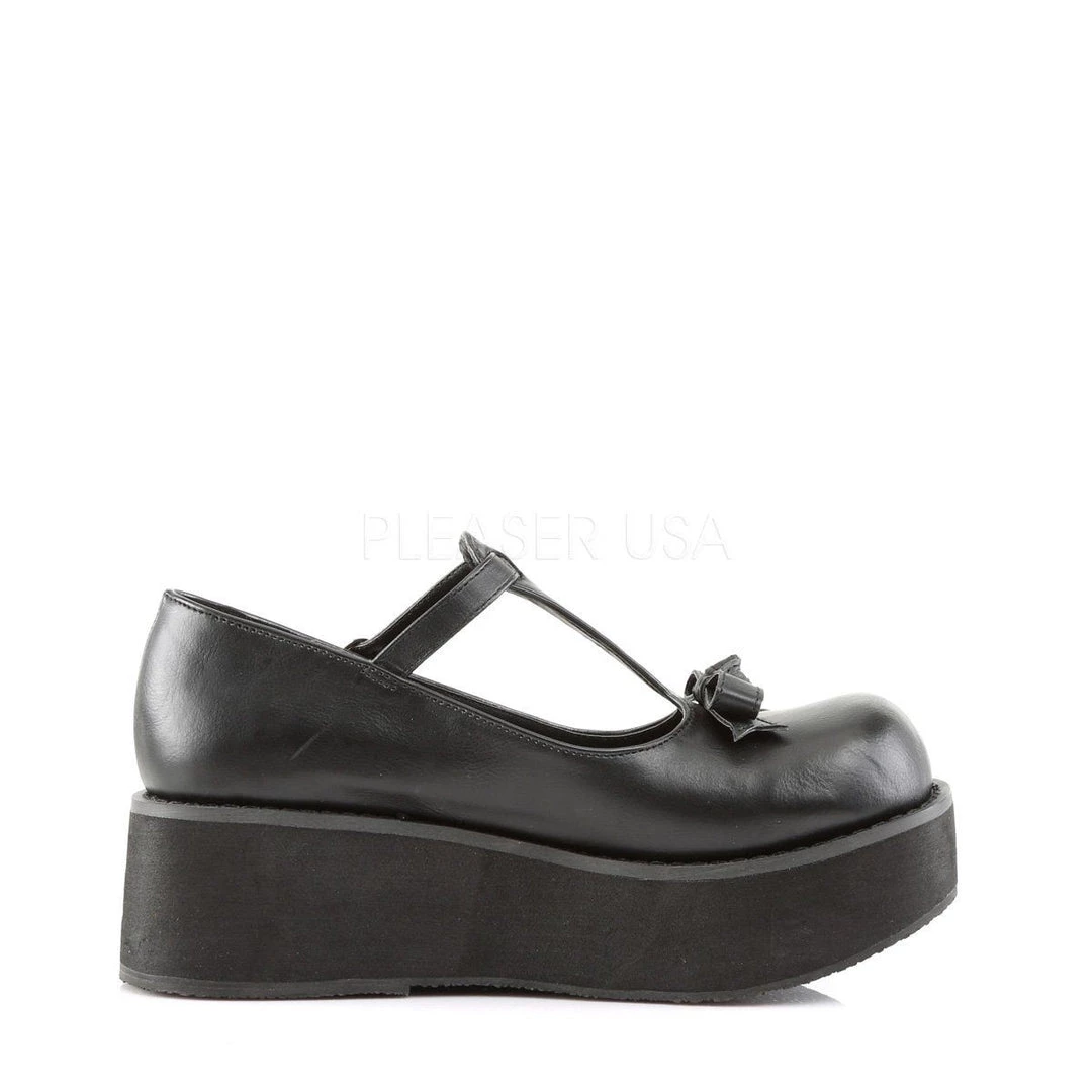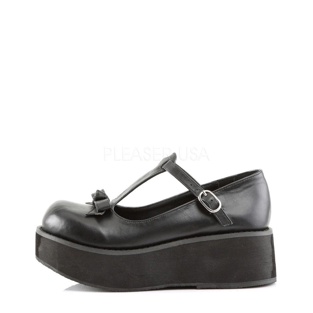 Details: 2 1/4 Inch Plaform T-Strap with Bow & Buckle Detail.