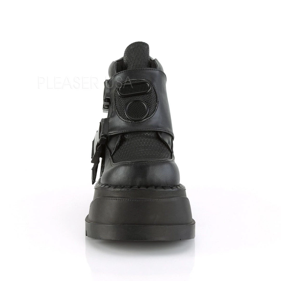 Additional Info: 4 3/4″ (121mm) Wedge Platform Bootie Featuring Padded Ankle, Front Sheild w/ Snap Buckles and Ventilator Detail.