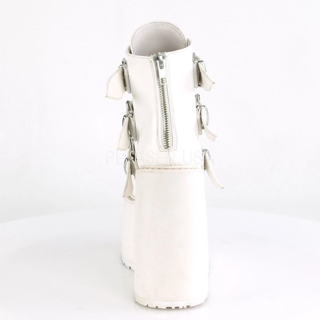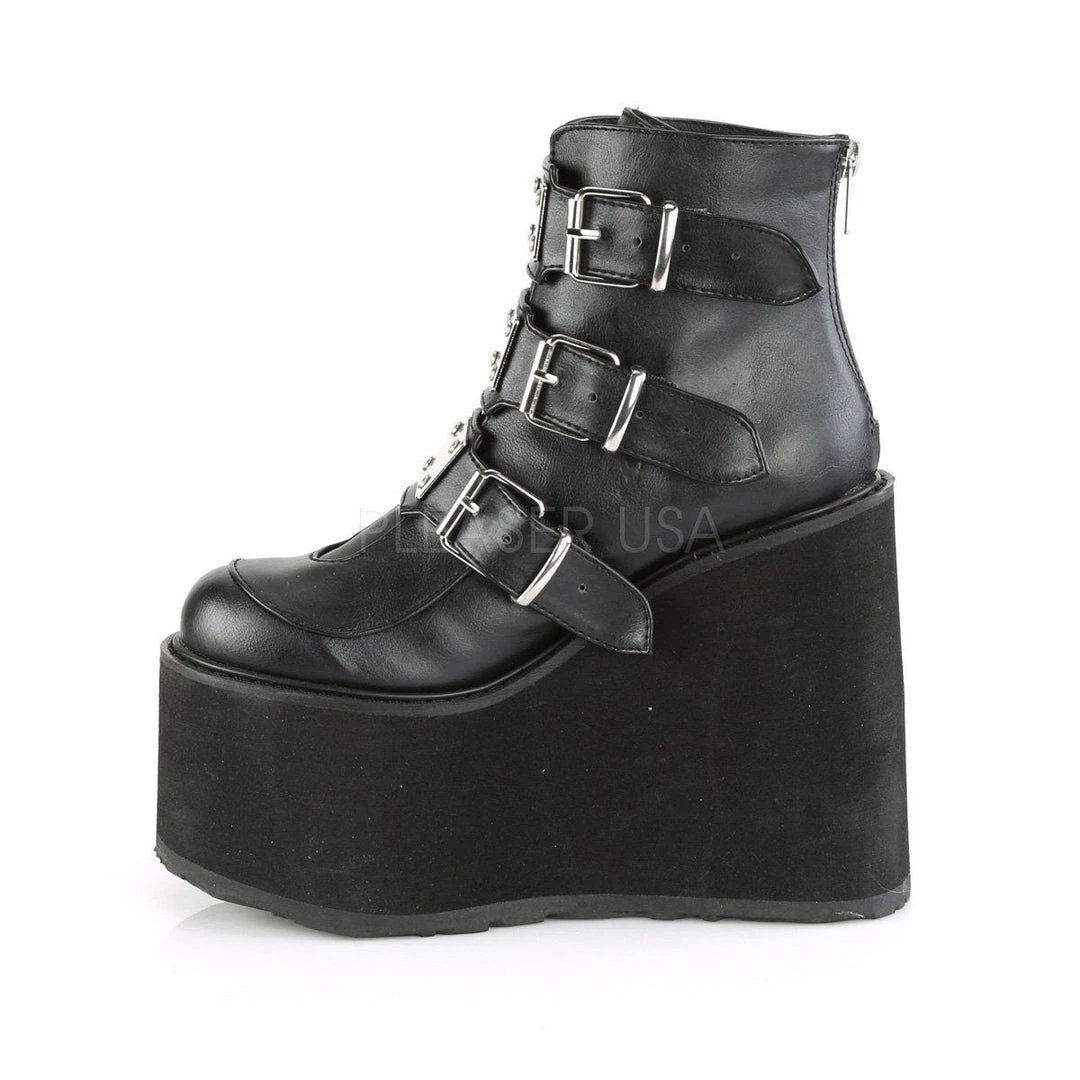 Details: 5 1/2 Inch Plaform Ankle Boot with 3 Buckle Straps, Back Zip.