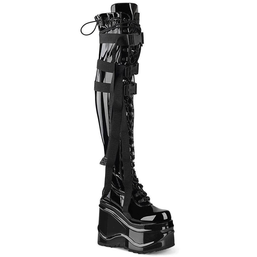 Details: 6 Inch Wedge Plaform Lace-Up Stretch Thigh Boot, Side Zip.