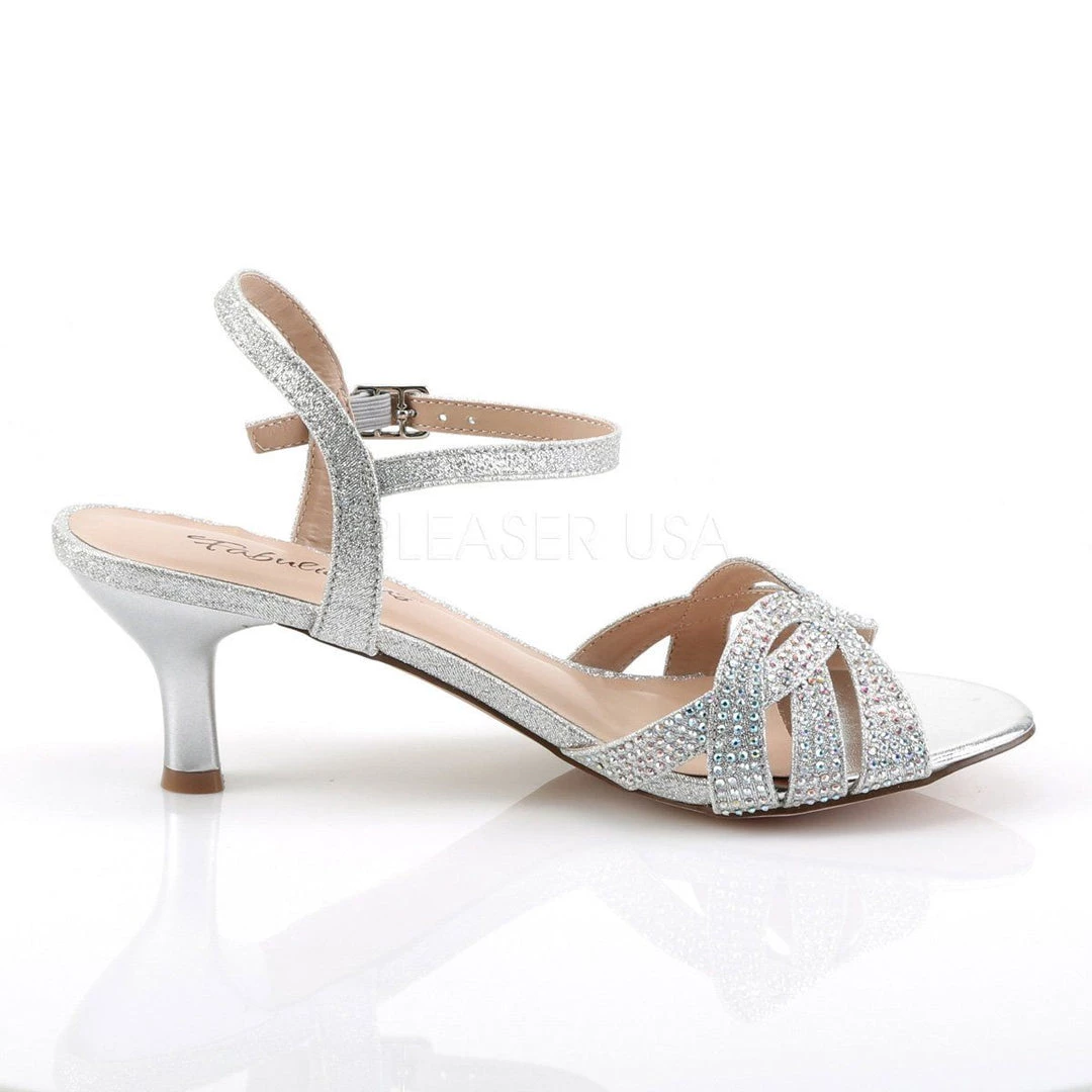 Additional Info: 2 1/2″ (6.4cm) Kitten Heel Ankle Strap Criss-Cross Sandal with Slv Multi Rhinestones on Front Vamp Shimmering Fabric.