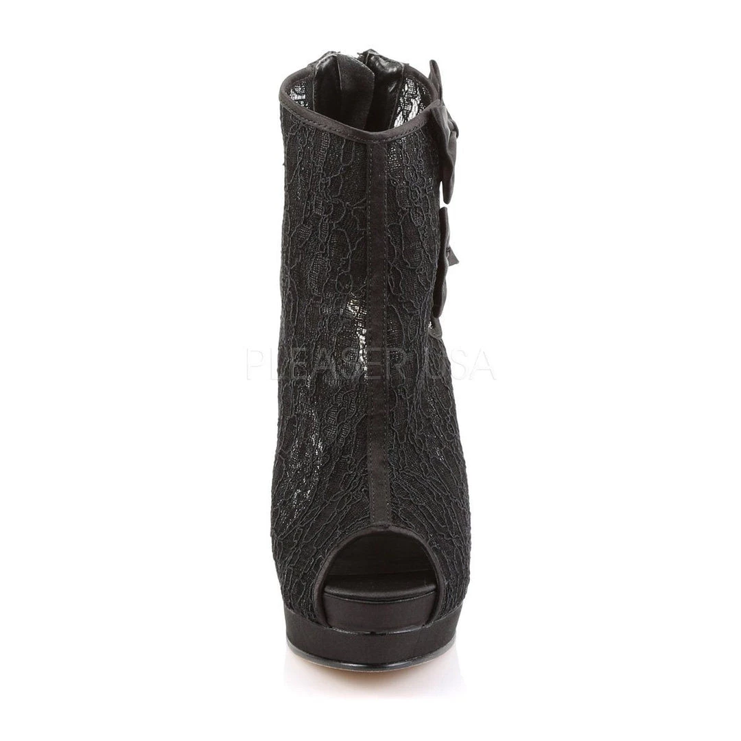 Details: 5 1/4 Inch Heel, 1 1/2 Inch Plaform Peep Toe Bootie with Bows & Back Zip.