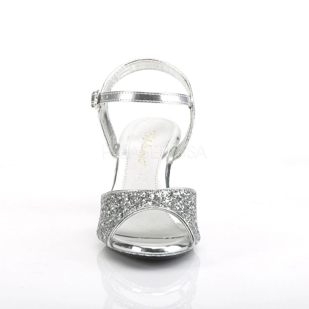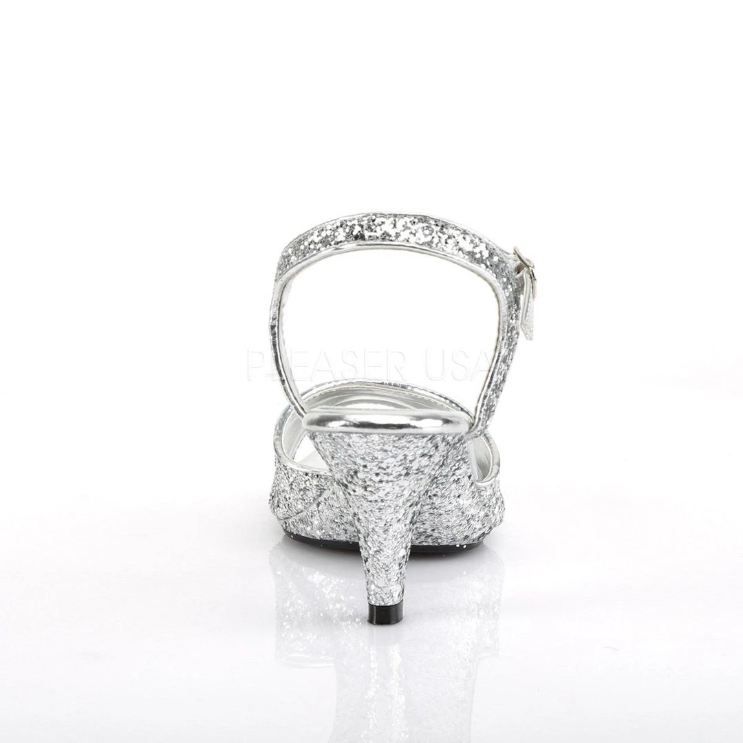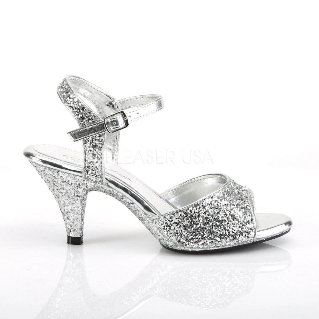 Details: 3 Inch Heel, 1/8 Inch Plaform Ankle Strap Sandal with Glitter.