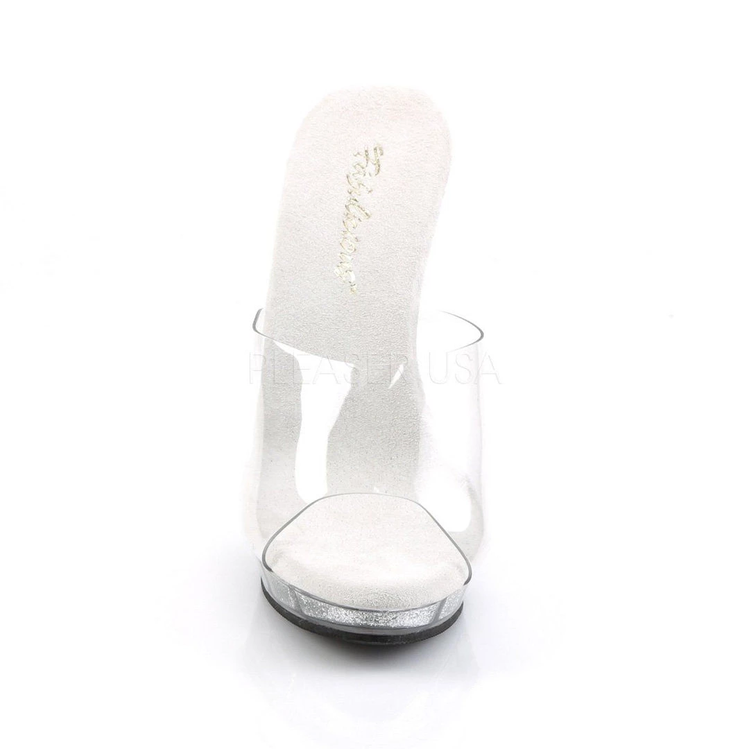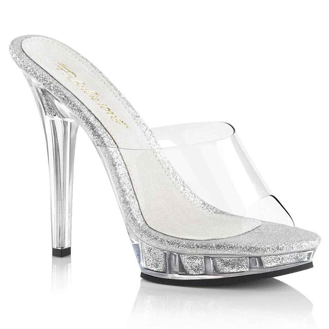 Details: 5 Inch Heel, 3/4 Inch Plaform Glitter Filled Slide.