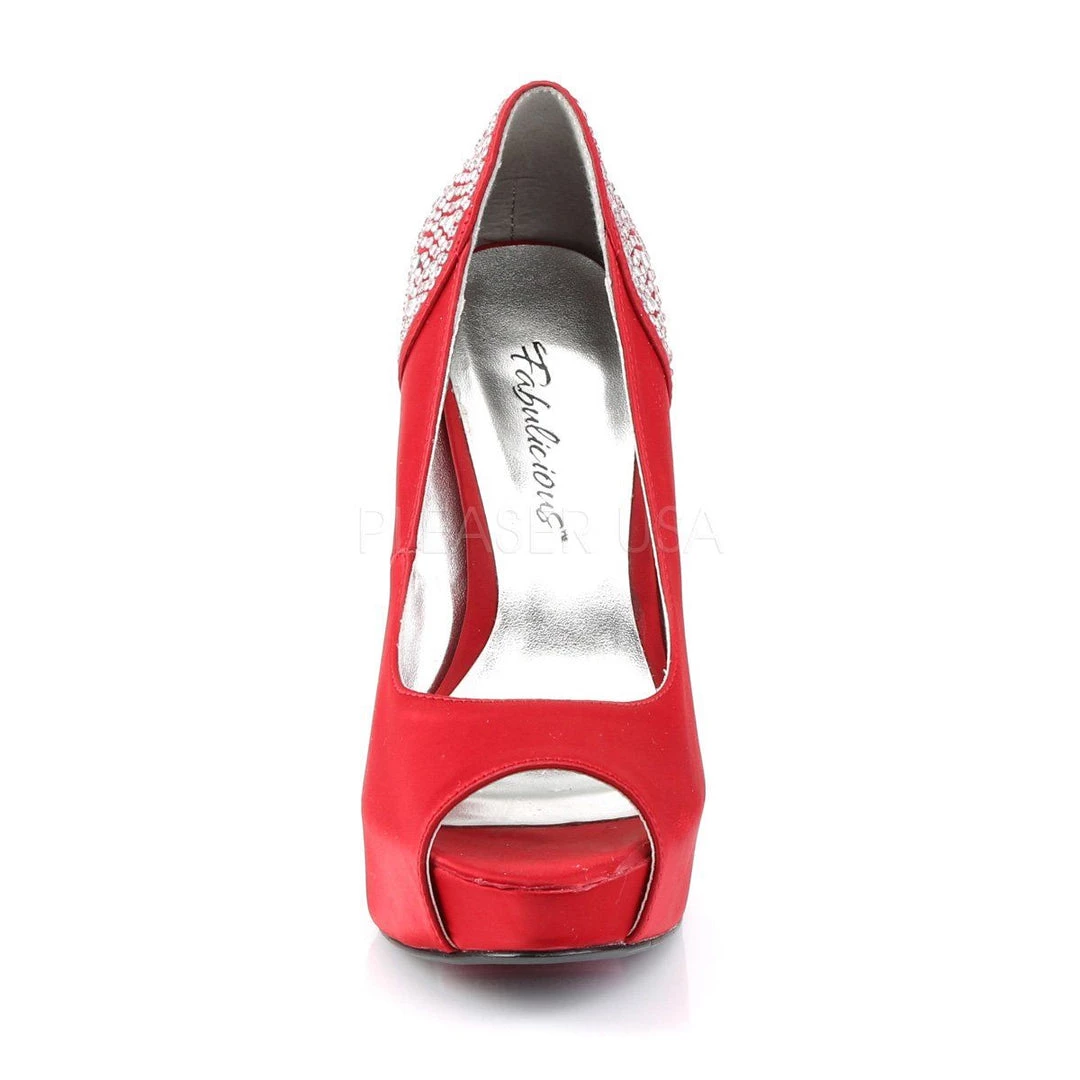 Additional Info: 5″ (12.7cm) Heel, 1″ (2.5cm) Hidden Platform Peep Toe Pump with Rhinestones Embedded on Heel and Back Counter.