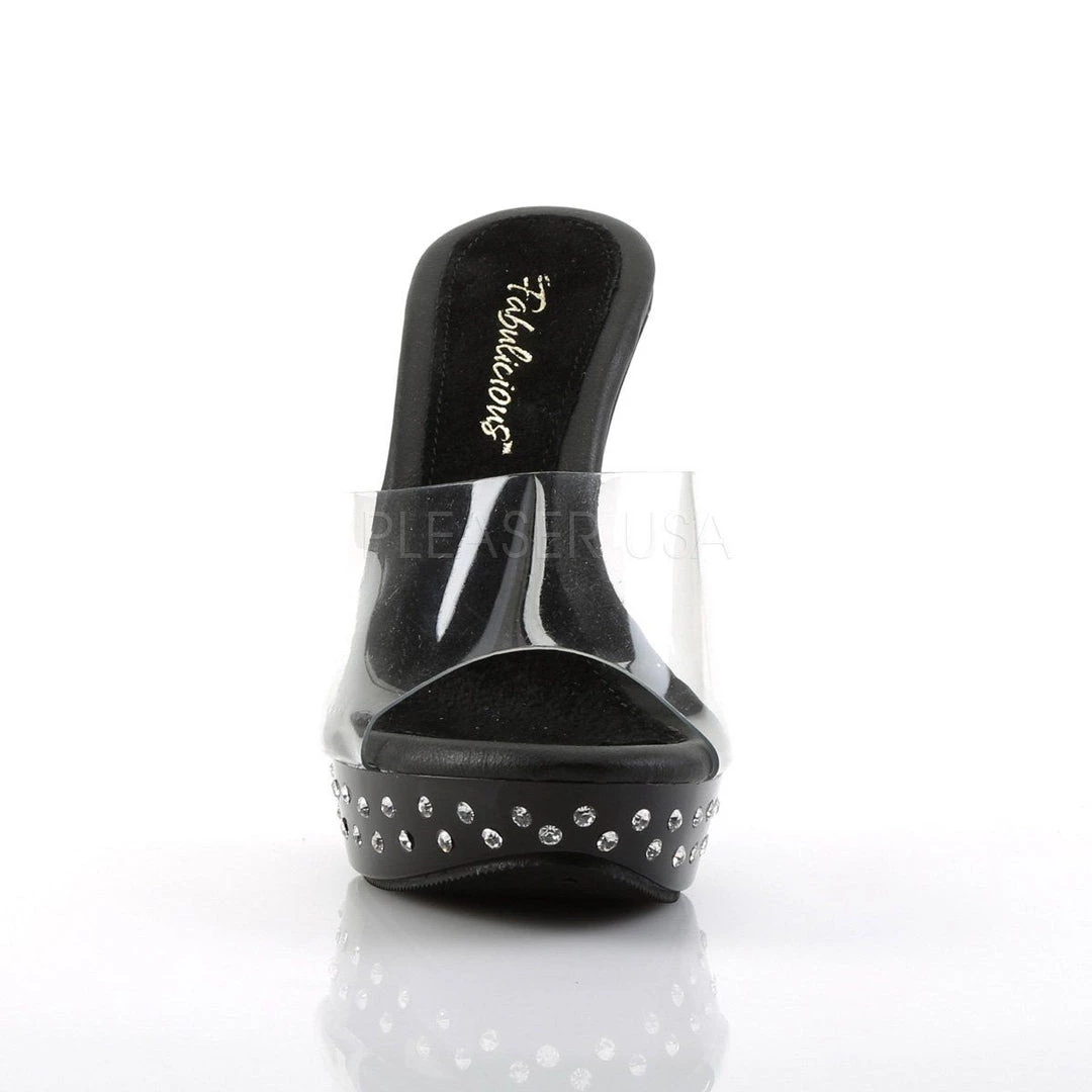 Details: 5 Inch Heel, 1 Inch Rhinestone Studded Plaform Slide.