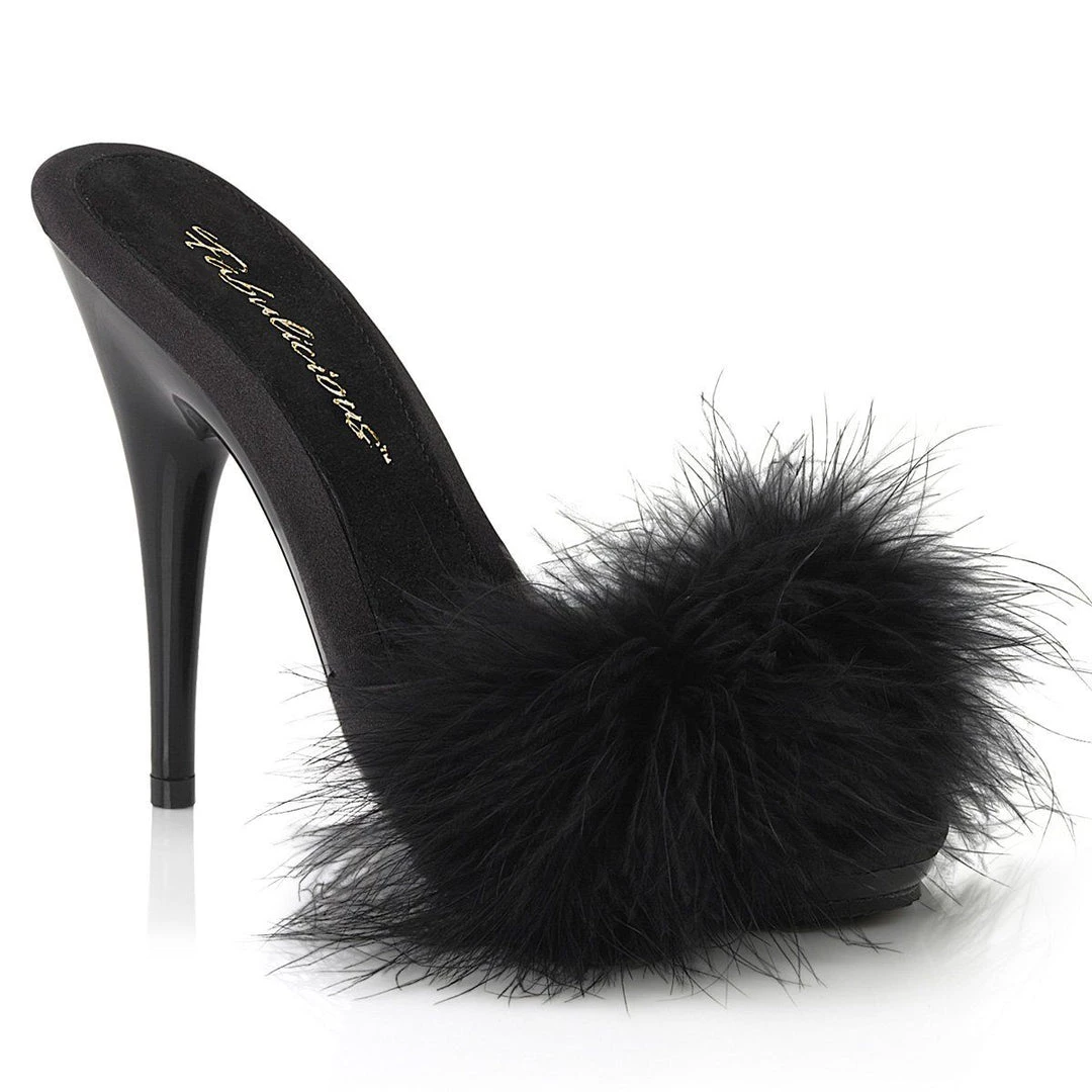 Details: 5 Inch Heel, 3/8 Inch Plaform Marabou Slide Sandal.