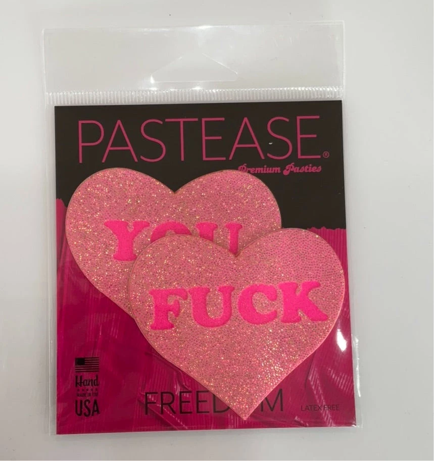 Love: ‘FUCK YOU’ Heart Nipple Pasties by Pastease® are hand-made in the USA of soft form-fitting material that forms to curves to resist wrinkling over hardening nipples. Just peel-and-stick on clean, dry skin!