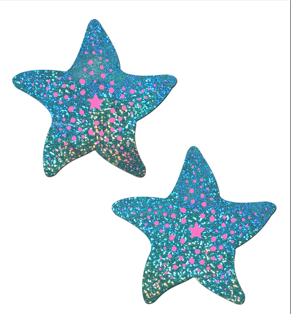 Starfish: Twinkling Seafoam Green & Pink Print Sea Star Nipple Pasties by Pastease® are hand-made in the USA of durable shiny pleather material that forms to curves and resists wrinkling over hardening nipples.