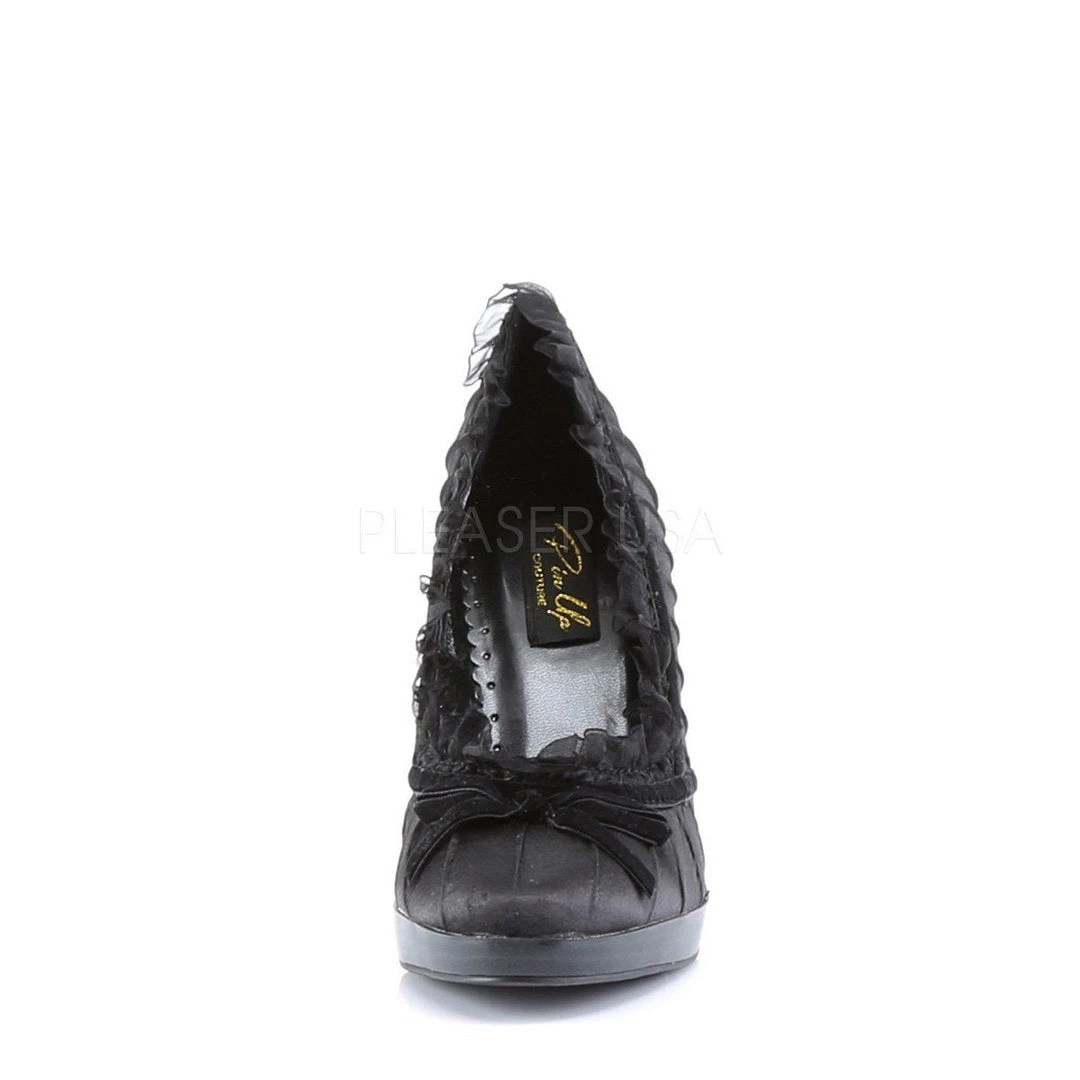 Additional Info: 4 1/4″ (10.8cm) Heel, 3/4″ (1.9cm) Hidden Platform Pump with Lace Fringe and Bow.