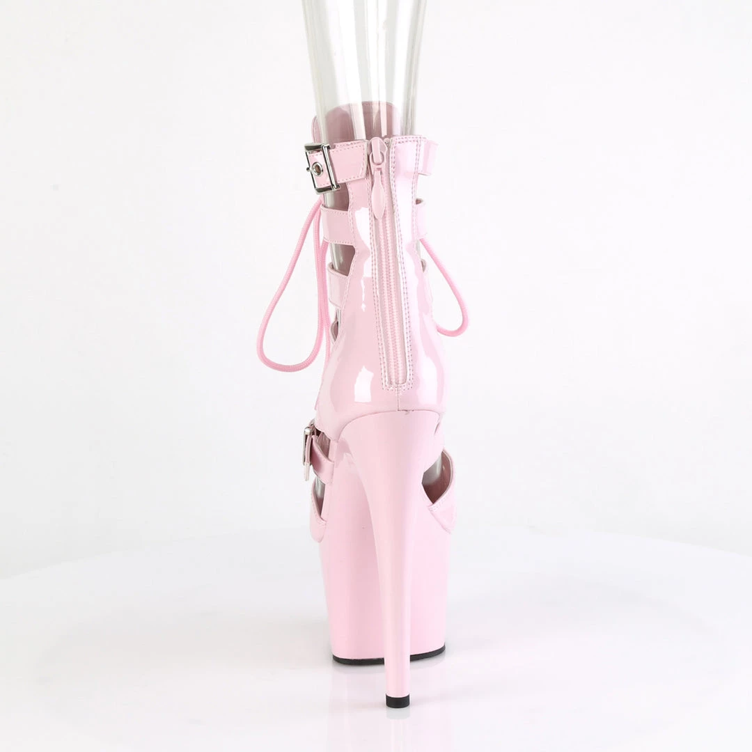 Details: 7 Inch Heel, 2 3/4 Inch Plaform Strappy Lace-Up Cage Bootie, Back Zip.