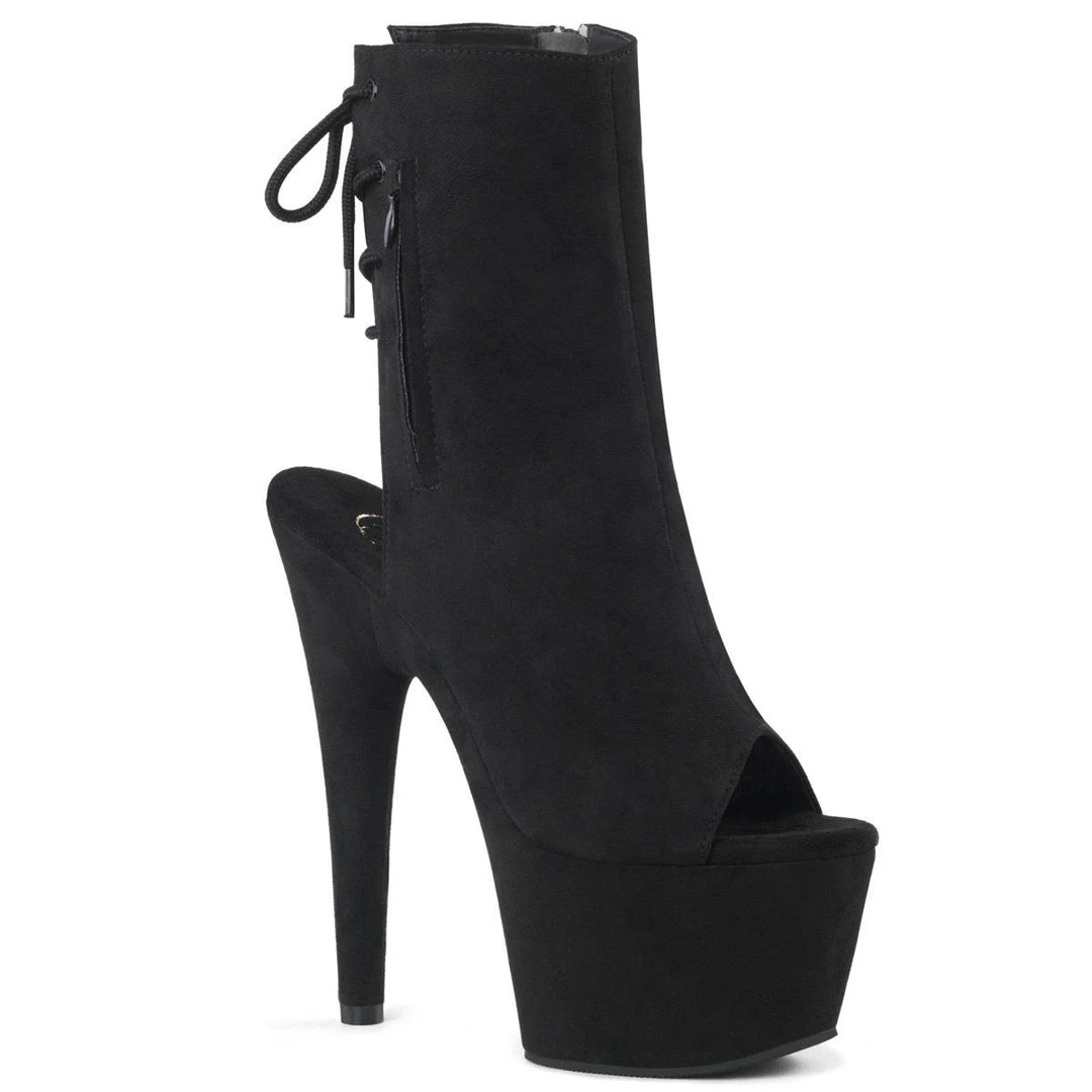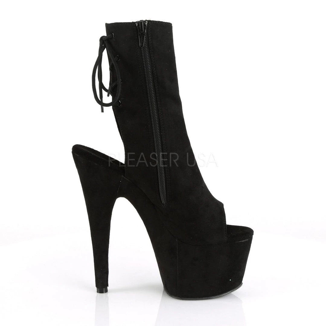 Details: 7 Inch Heel, 2 3/4 Inch Plaform Open Toe/Heel Ankle Boot, Side Zip.