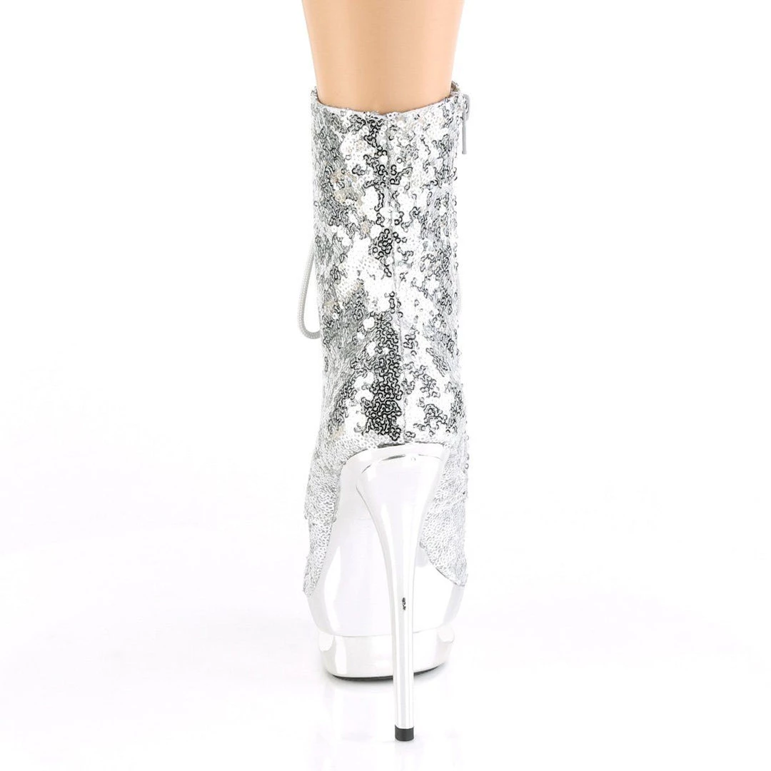 Details: 6 Inch Heel, 1 1/2 Inch Plaform Lace-Up Sequined Ankle Boot, Side Zip.