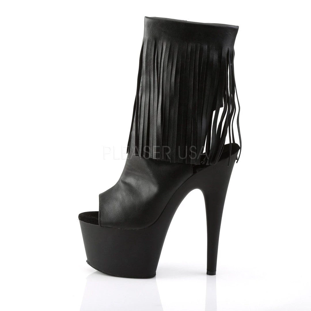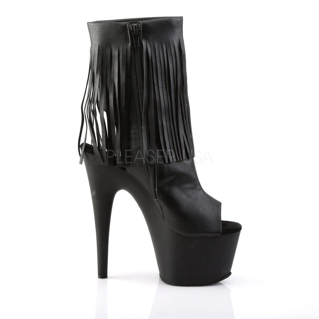 Additional Info: 7″ (17.8cm) Stiletto Heel, 2 3/4″ (7cm) Platform Open Toe/Stiletto Heel Fringe Ankle Boot, Inner Side Zip Closure.