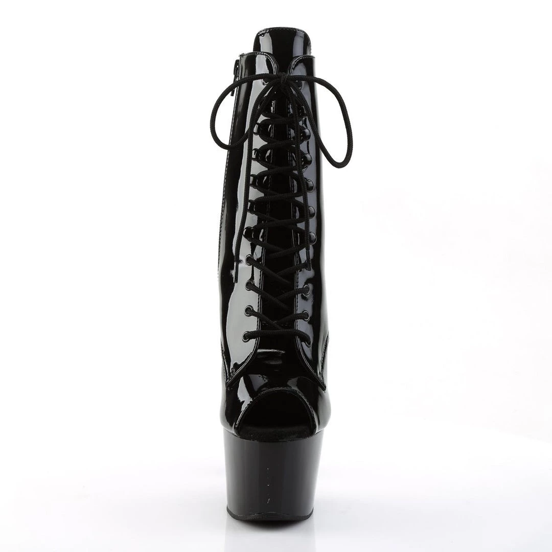 Additional Info: 7″ (17.8cm) Stiletto Heel, 2 3/4″ (7cm) Platform Peep Toe Front Lace-Up Ankle Boot, Inner Side Zip Closure.