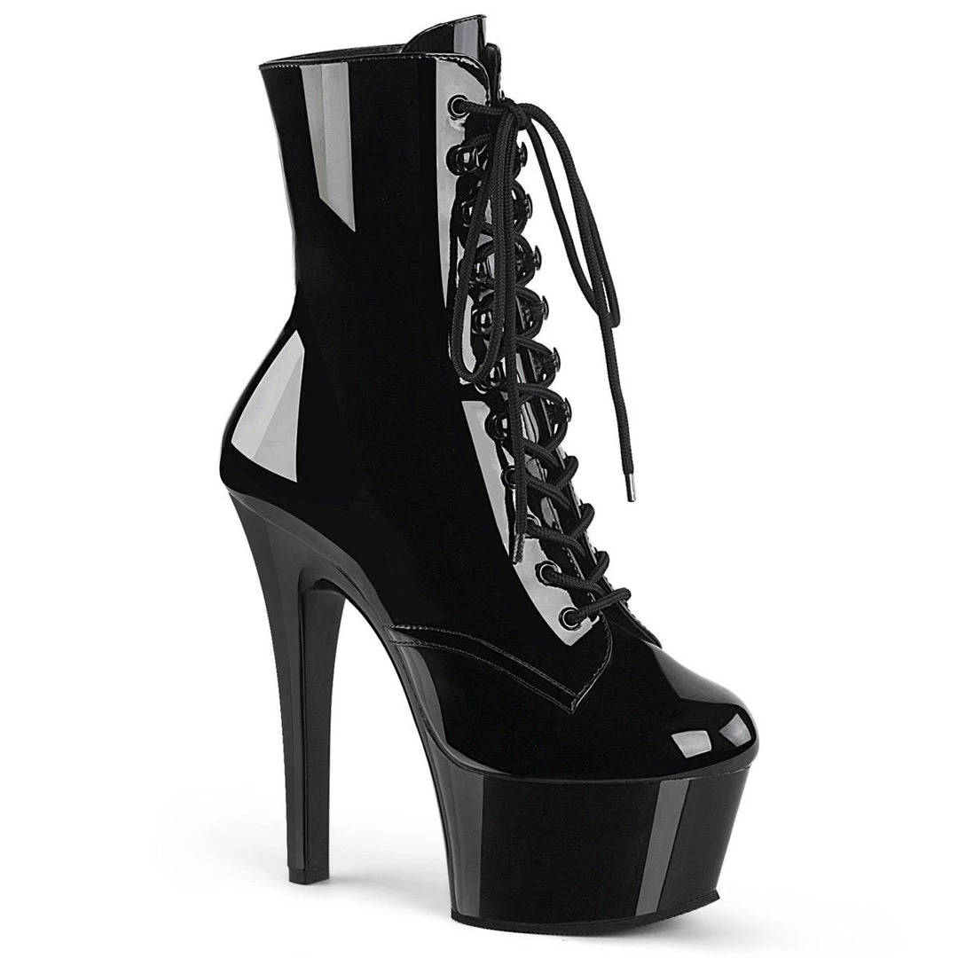 Details: 6 Inch Heel, 2 1/4 Inch Plaform Lace-Up Ankle Boot , Side Zip.