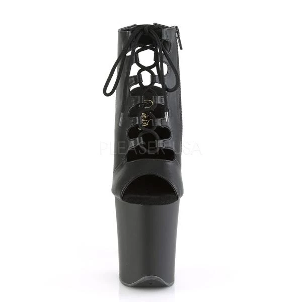 Details: 8 Inch Heel, 4 Inch Plaform Open Toe/Heel Front Lace Up Ankle Bootie.