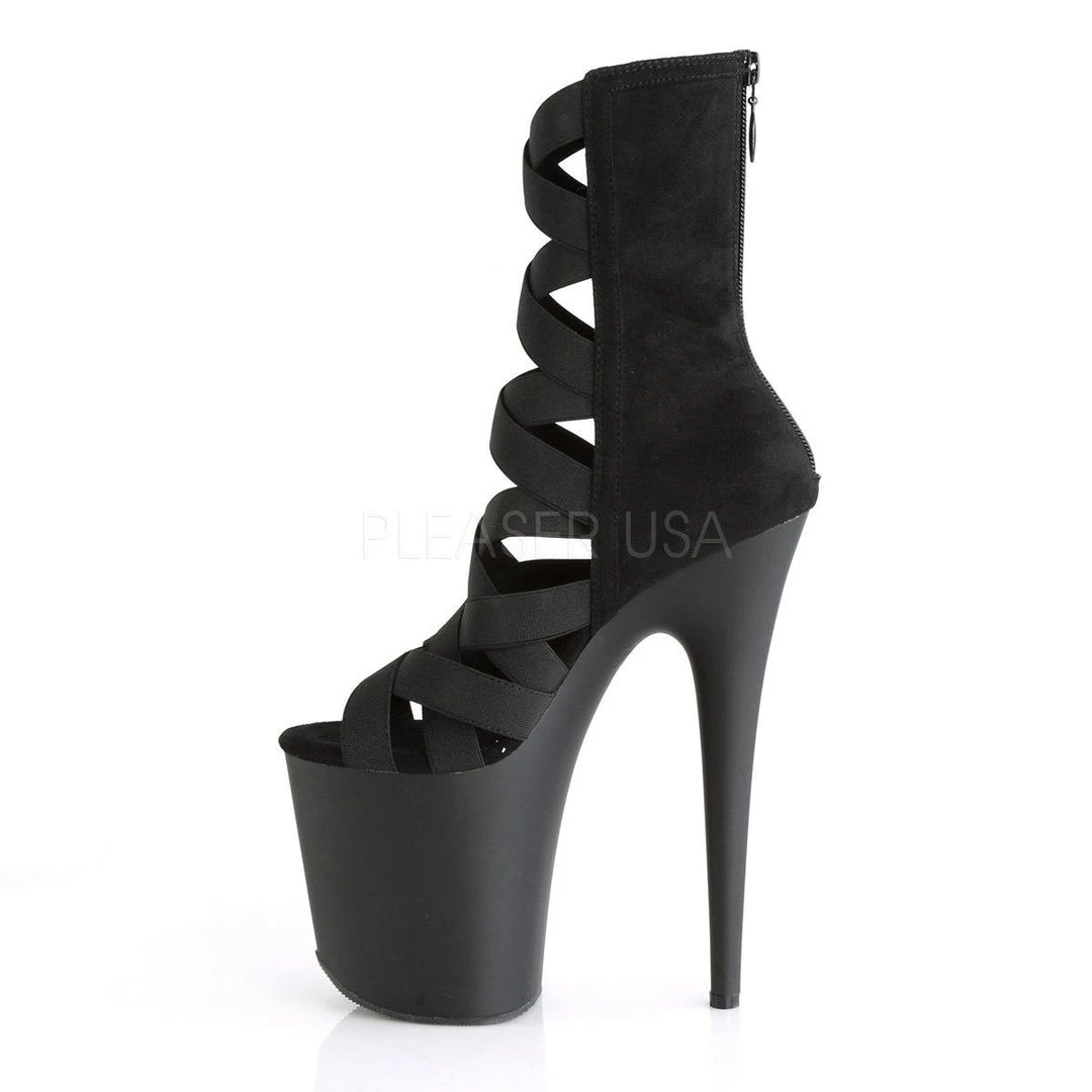 Details: 8 Inch Heel, 4 Inch Plaform Criss Cross Bootie Sandal, Back Zip.