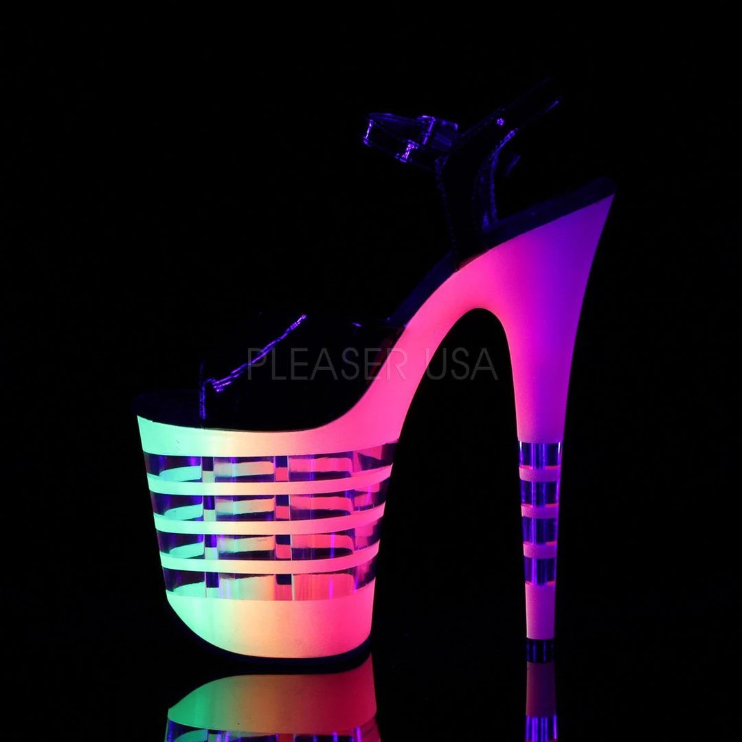 Additional Info: 8″ (20.3cm) Stiletto Heel, 4″ (10.2cm) Platform Ankle Strap Sandal Featuring Neon UV Reactive Bottom with Lines.