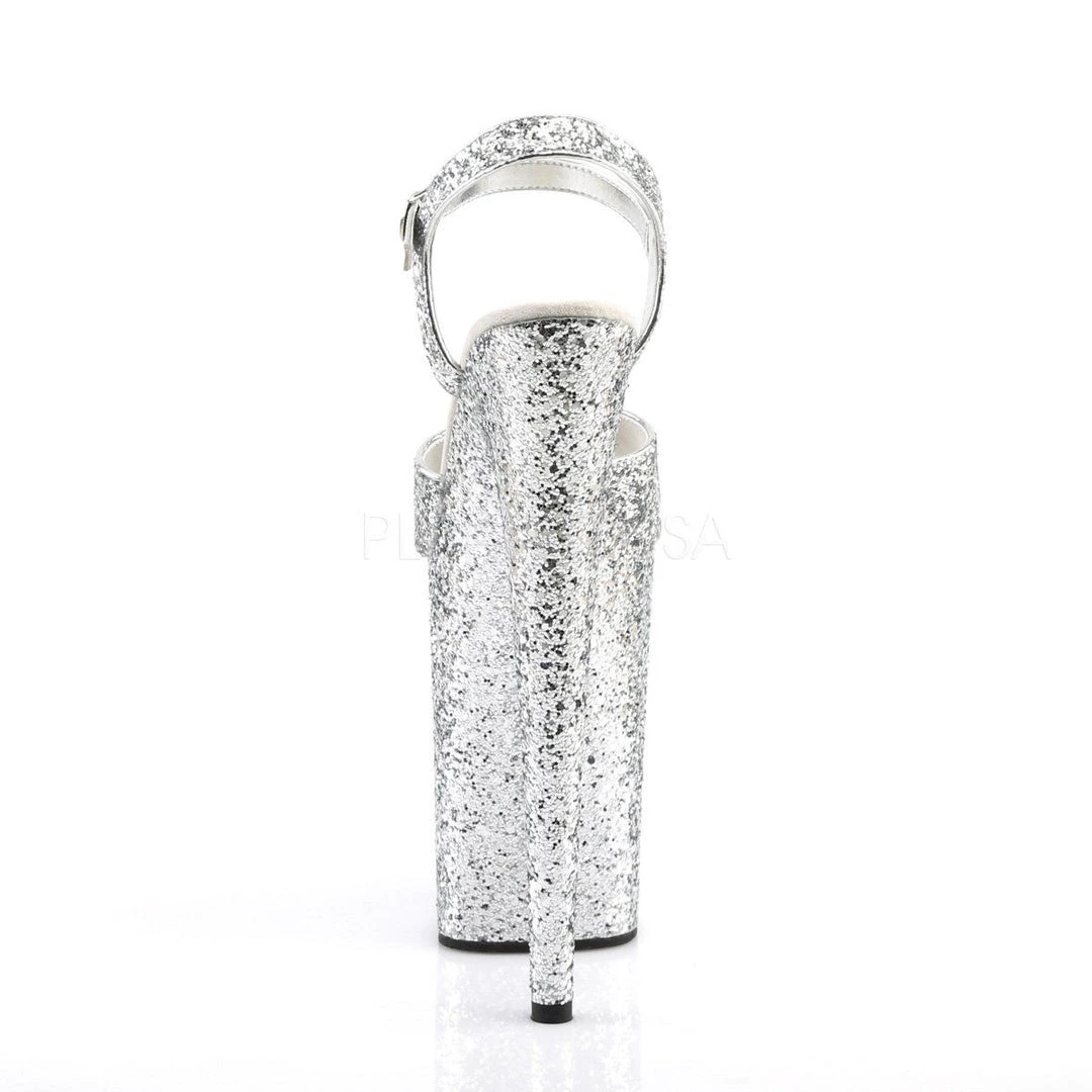 Details: 9 Inch Heel, 5 1/4 Inch Plaform Glitter Ankle Strap Sandal.
