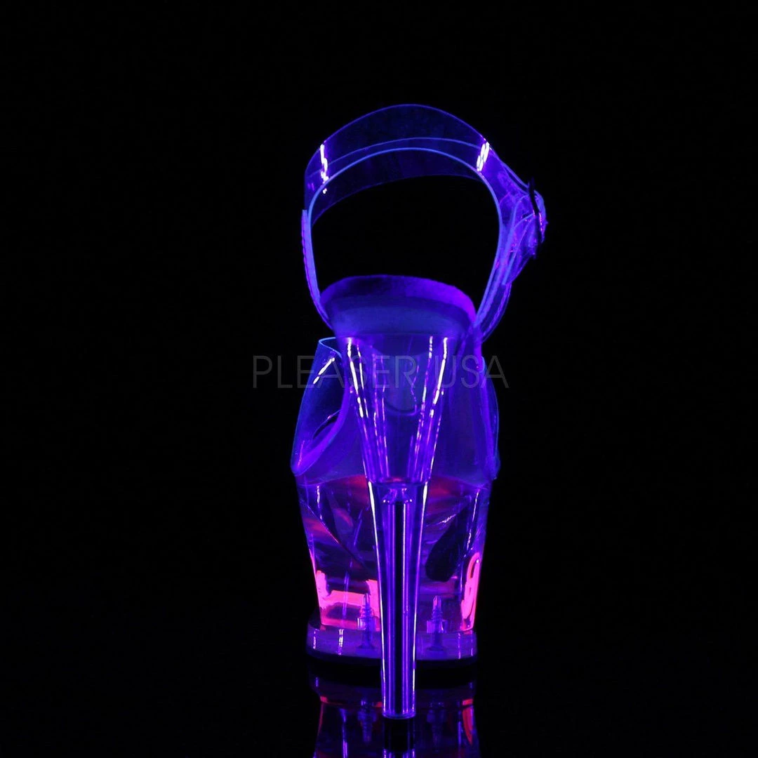 Additional Info: 7″ (178mm) Heel, 2 3/4″ (70mm) Cut-Out Platform Ankle Strap Sandal Featuring Blacklight Reactive Pussy Cat in the Platform.