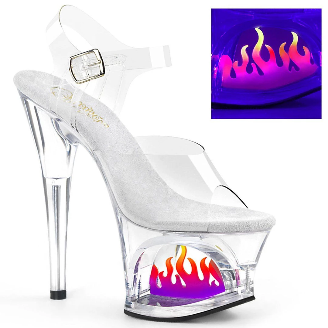 Additional Info: 7″ (178mm) Heel, 2 3/4″ (70mm) Cut-Out Platform Ankle Strap Sandal Featuring Ombre Flame in the Platform.
