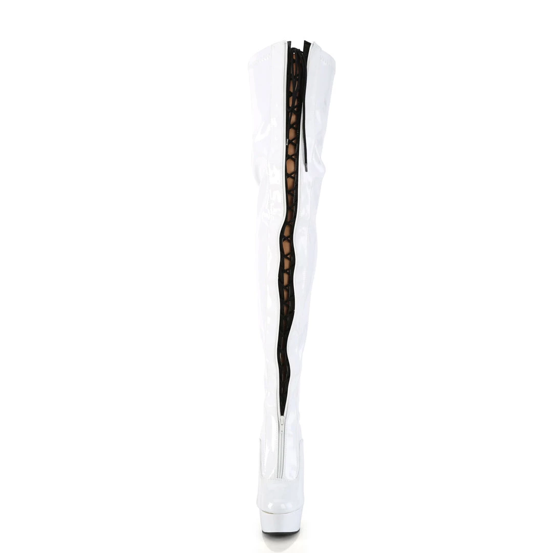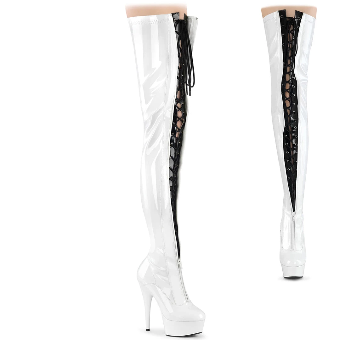 Details: 6 Inch Heel, 1 3/4 Inch Plaform Two Tone Thigh High Boot, Front Zip.