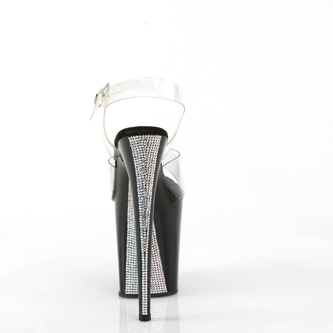 Additional Info: 8″ (200mm) Heel, 4″ (100mm) Platform Ankle Strap Sandal w/ Contrast Rhinestones on the Platform Underside & Back of Heel.