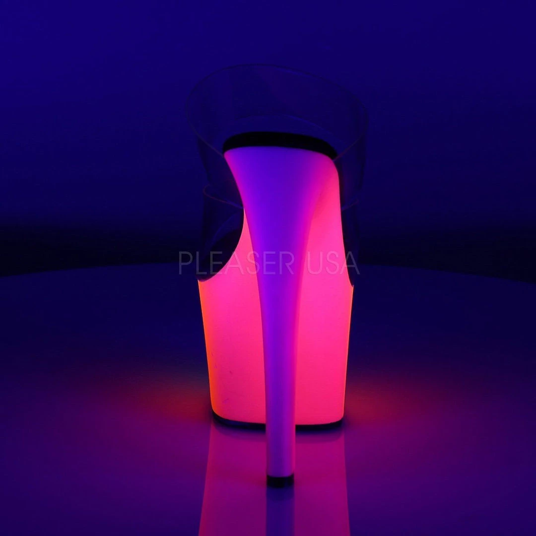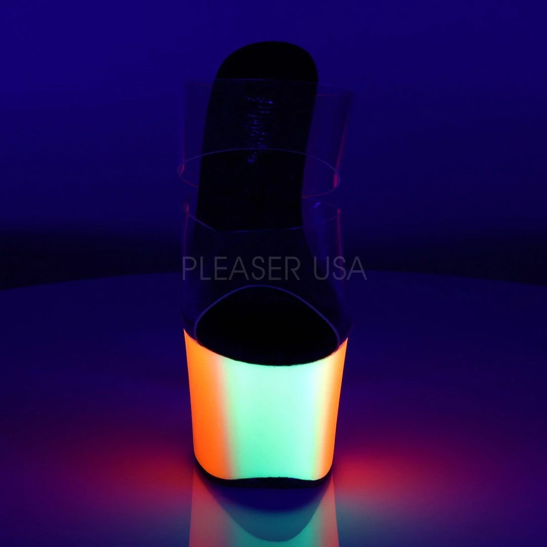 Details: 7 Inch Heel,2 3/4 Inch Plaform Two-Band Slide with Neon UV Reactive Bottom.
