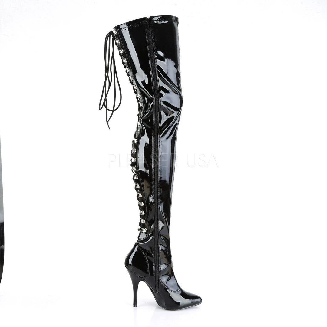 Additional Info: 5″ (12.7cm) Heel Open Back D-Ring Stretch Thigh Boot, Full Inner Side Zip Closure.