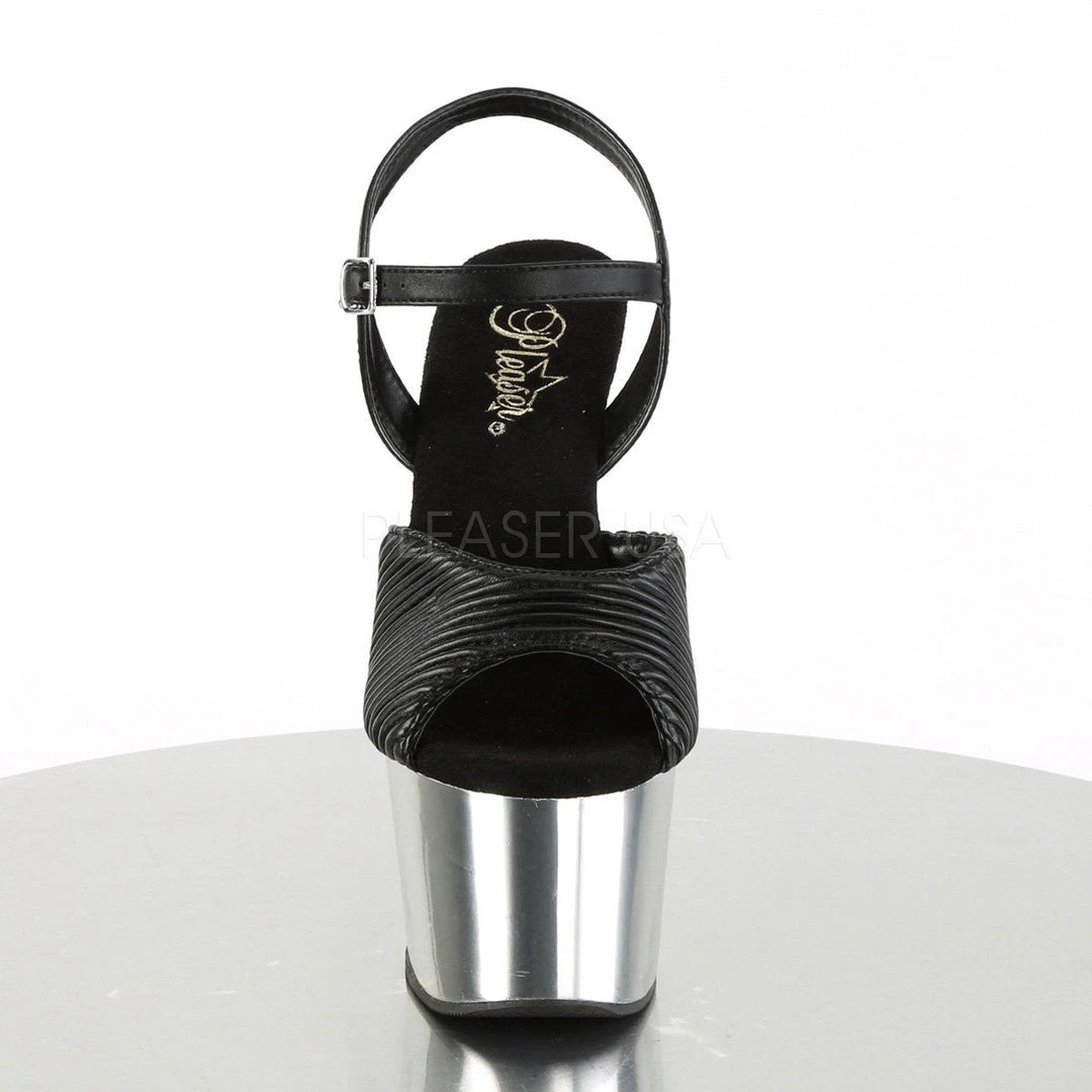Details: 7 Inch Heel, 2 3/4 Inch Chrome Plated Plaform Ankle Strap Sandal.