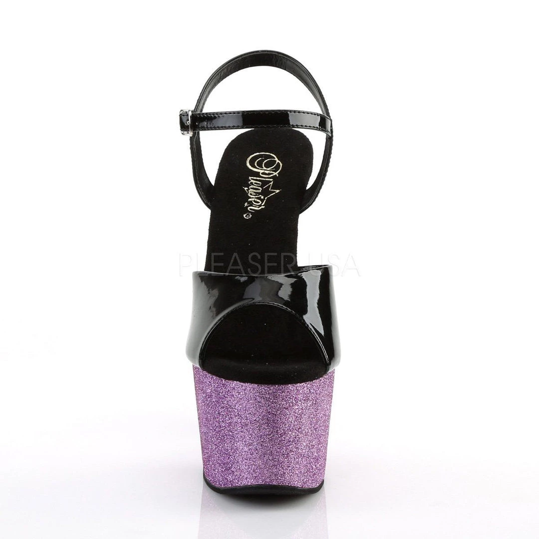Details: 7 Inch Heel, 2 3/4 Inch Ombre Glittered Plaform Ankle Strap Sandal.