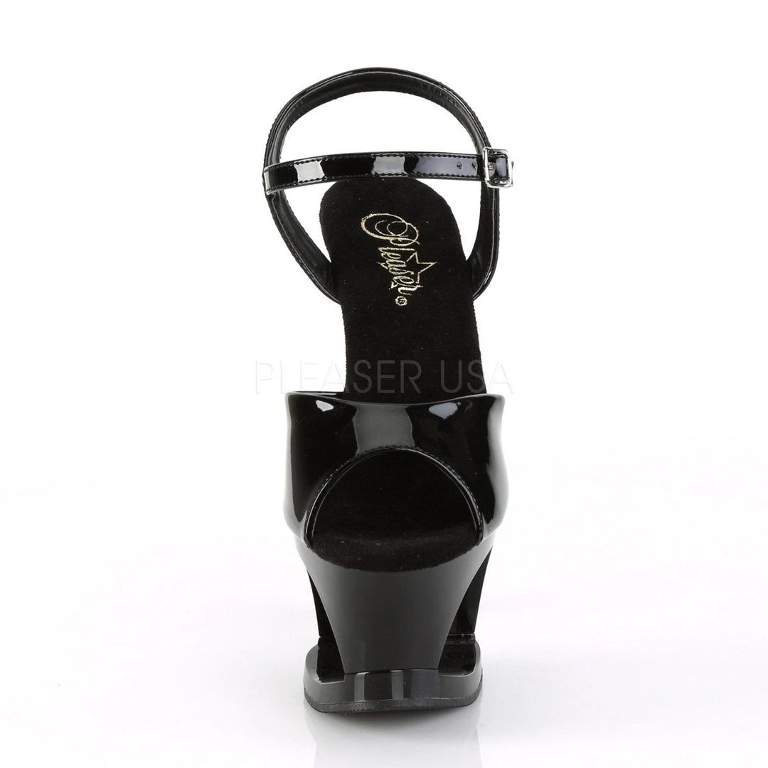 Details: 7 Inch Heel, 2 3/4 Inch Cut-Out Plaform Ankle Strap Sandal with Cat.