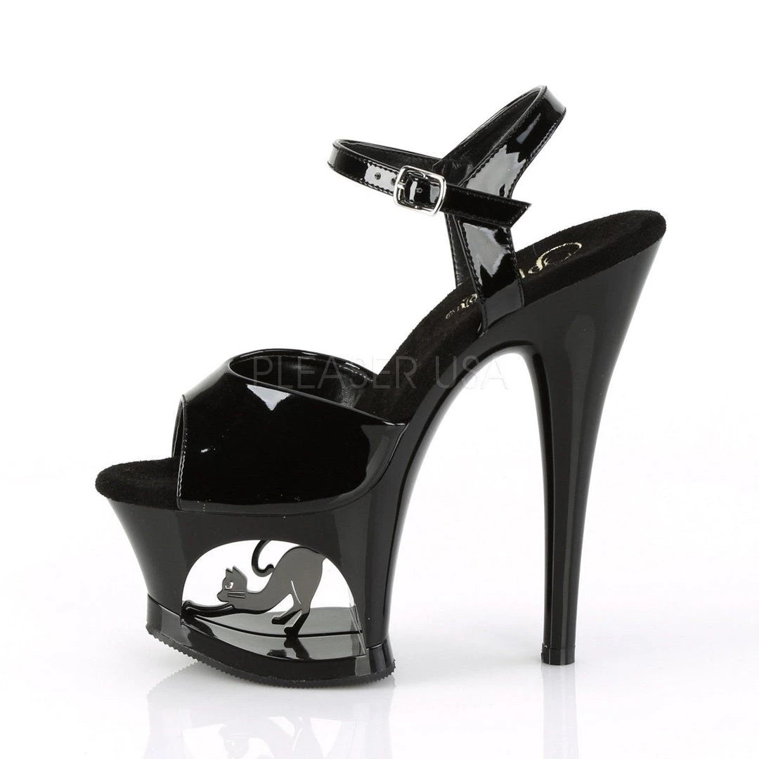 Additional Info: 7″ (178mm) Heel, 2 3/4″ (70mm) Cut-Out Platform Ankle Strap Sandal Featuring Chrome Plated Pussy Cat in the Platform.